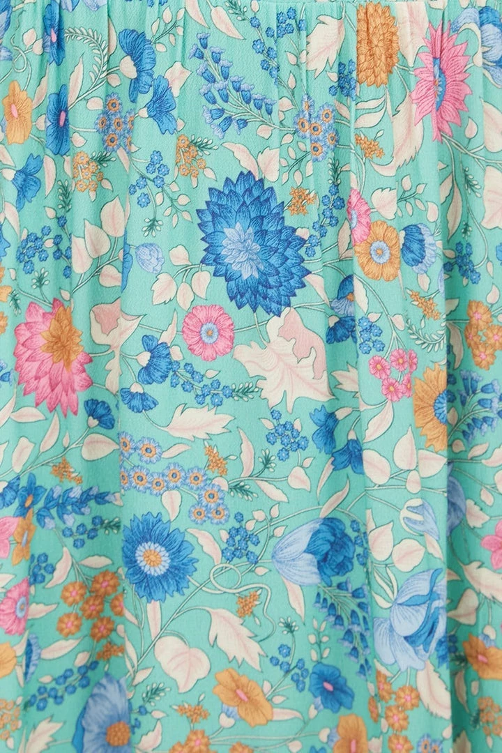 - Voluminous hem panel with romantic print placement and ethereal movement.