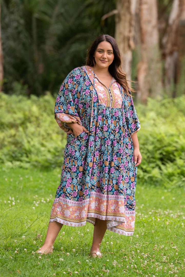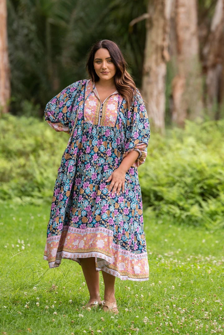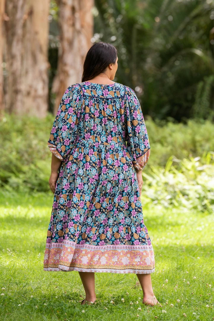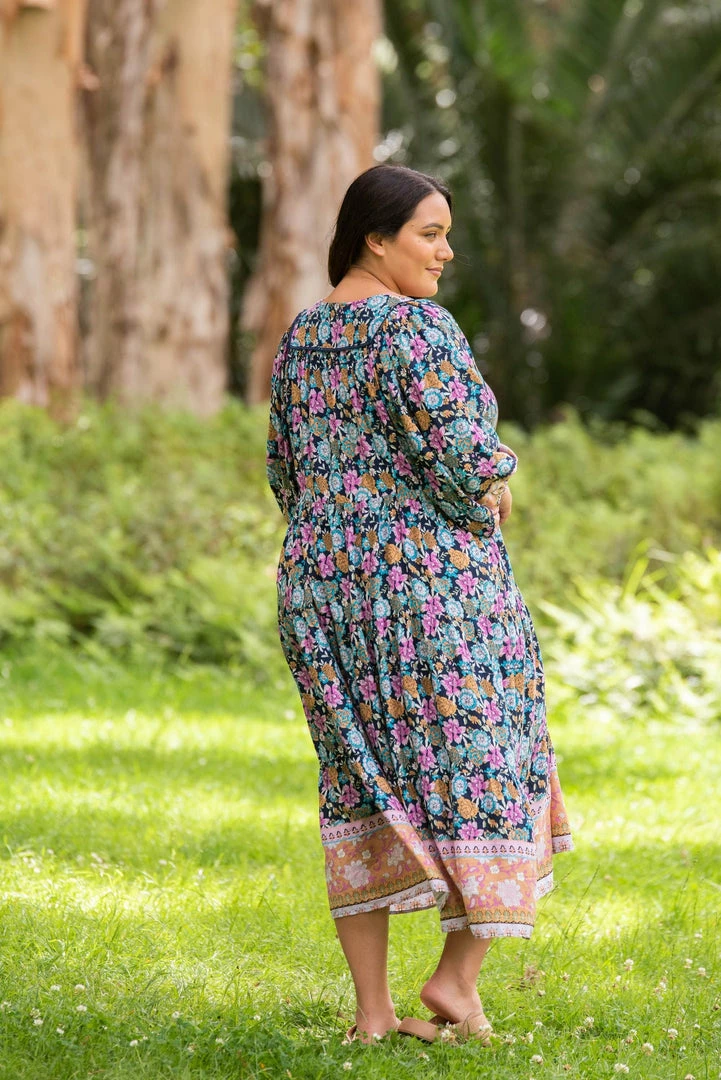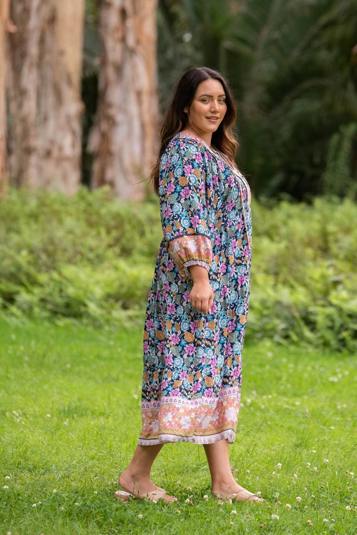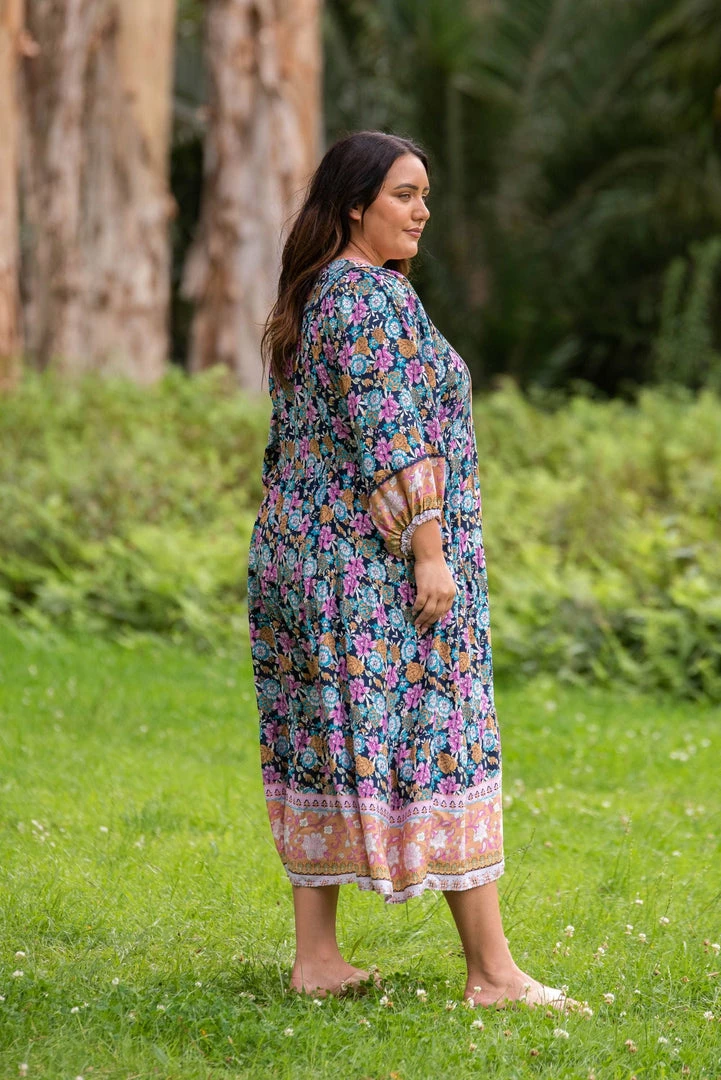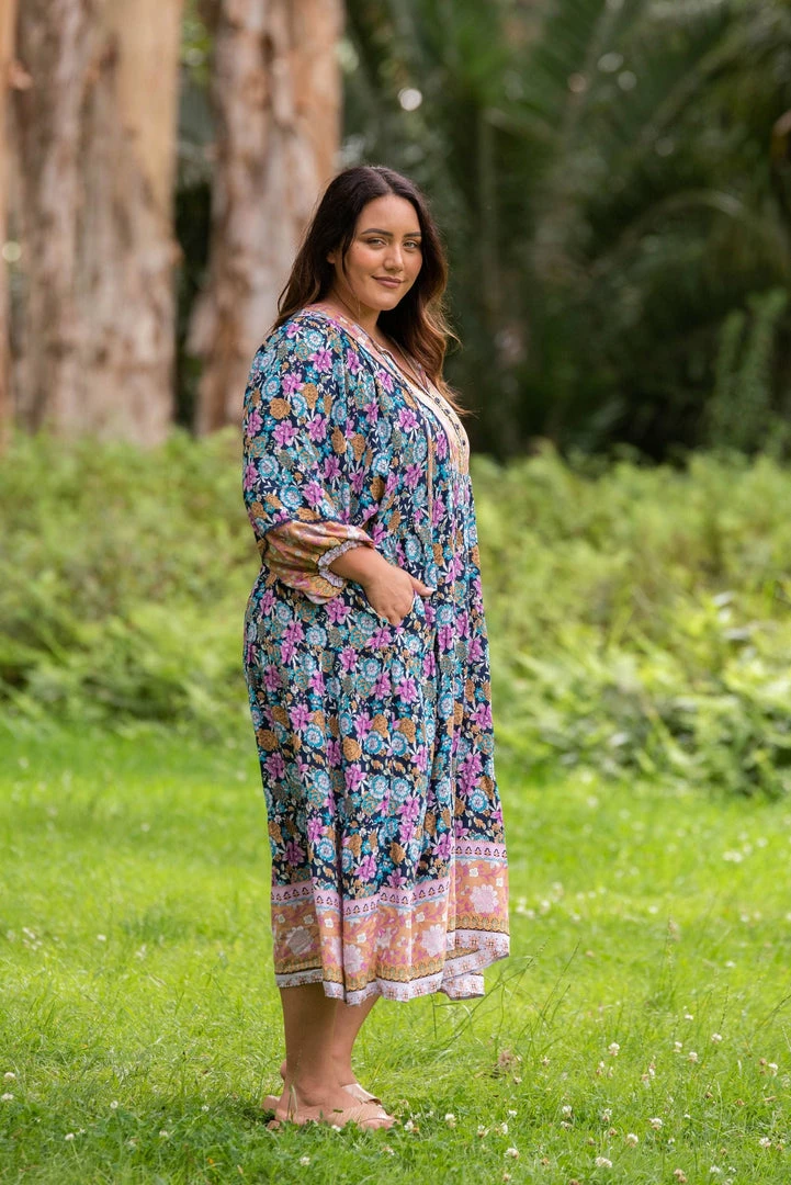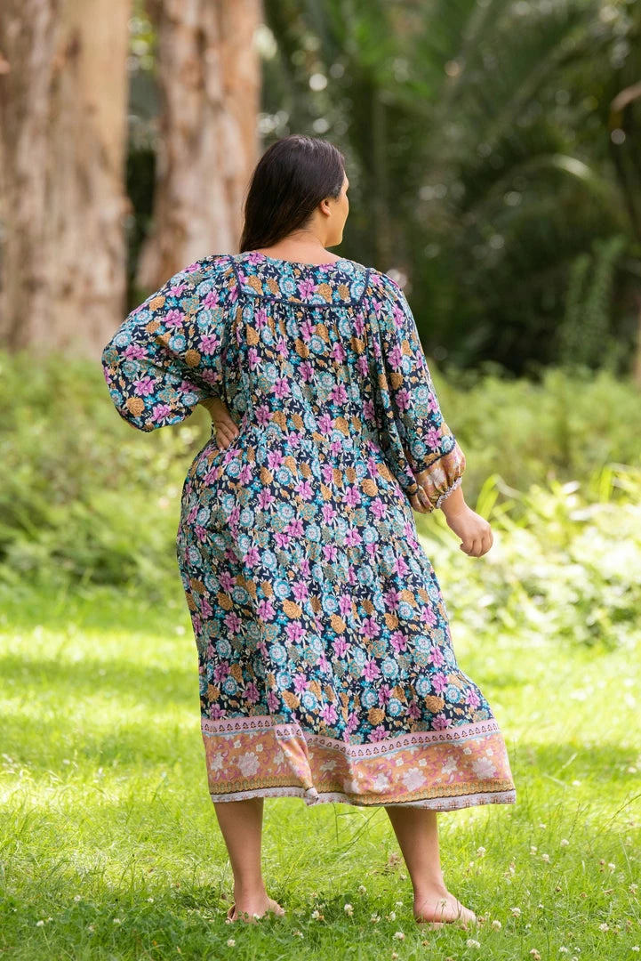 This Gorgeous Boho Australia 100% rayon maxi dress has a bright floral print in aqua, magenta and tan on a navy base with a beautiful border print