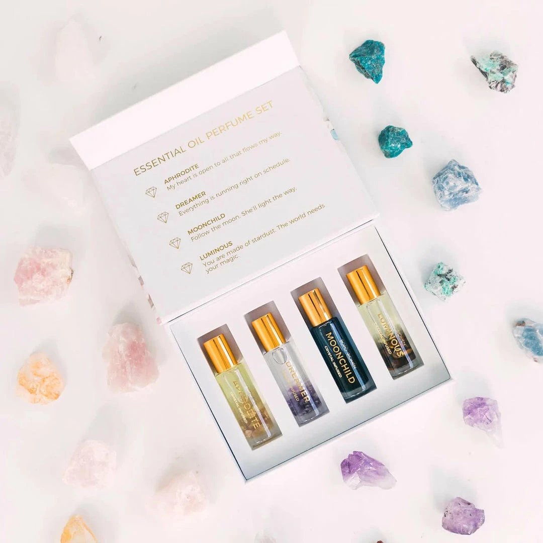 A beautiful insert gift box featuring our four original Crystal Infused Essential Oil Perfume Blends from our range. These are perfect as as a light natural perfume alternative and each roller features a crystal roller ball and make the perfect gift for that special someone! Dreamer: For Sleep & Calm. Ft. Dream Amethyst. Aphrodite: For Love & Abundance. Ft. Rose Quartz. Moonchild: For Ease & Flow. Ft. Obsidian. Luminous: Confidence & Inner Strength. Ft. Tigers Eye.