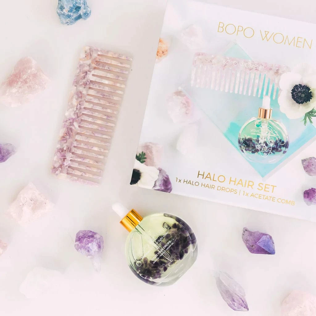 This beautiful set pairs our Halo Hair Drops with an eco-friendly acetate comb in a luxe gold foil insert gift box. Our hair oil is all natural and infused with jasmine absolute, neroli, grapeseed and argan oil. Extremely lightweight, this oil gently nourishes split ends and leaves hair feeling strong, shiny and smooth. Suitable for all hair types. Completely free from parabens, sulfates and pthalates. Our acetate comb is made from high quality, plant-based Acetate and is a beautiful lilac tortoise shell design. Arrives in a lilac gold foil pouch for storage.