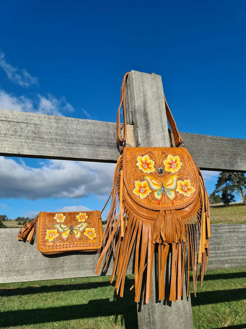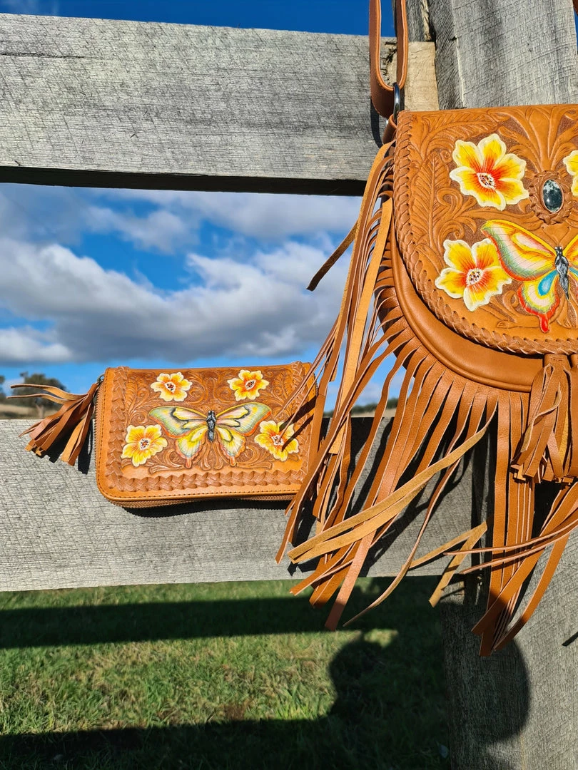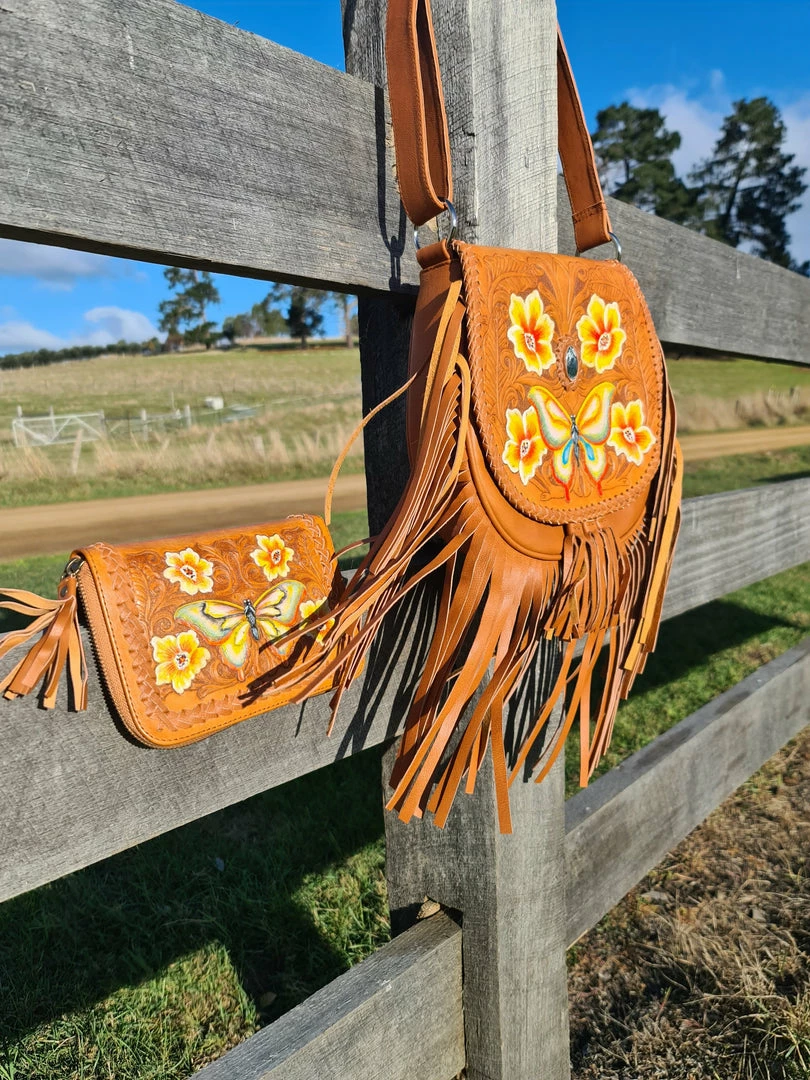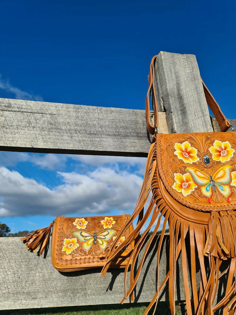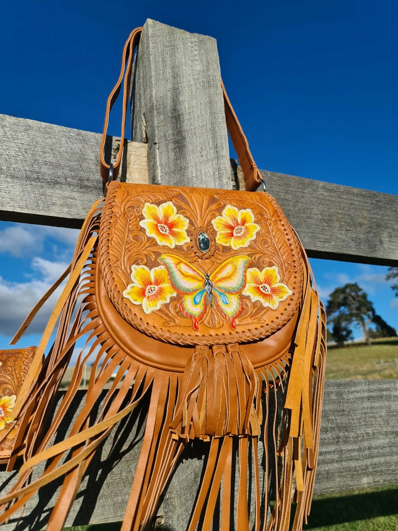 In our newest Tan colourway, the Butterfly boho leather cross body Bag is one of ‘Celestial Gypsy’ finest creations. Intricate butterfly and florals hand tooling, silver hardware, adjustable strap and full fringing at the bottom with Tassels.