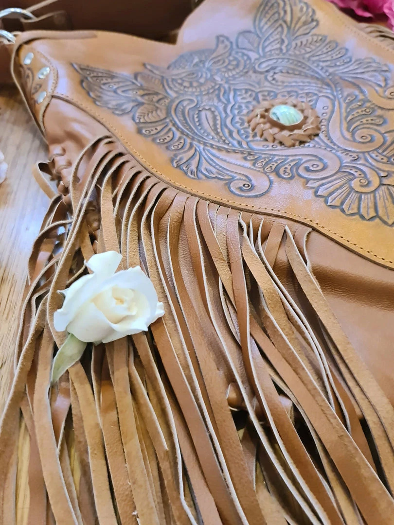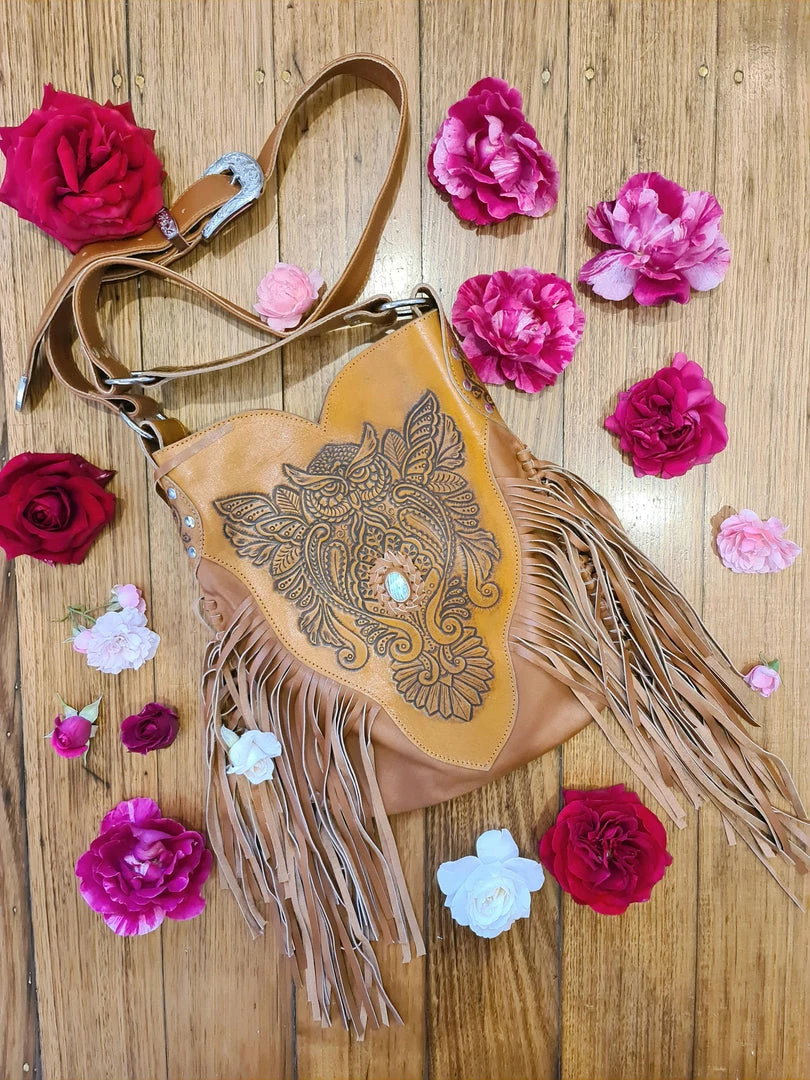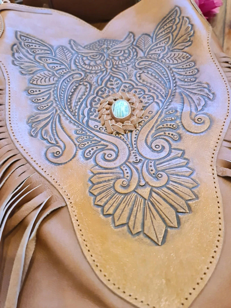 Introducing the ‘Owl Cross Body Bag’ by Celestial Gypsy. This stunning bohemian leather handbag features a hand-tooled owl with a seashell inlay. This beautiful genuine leather handbag has Tassels that take this bag to the next level.