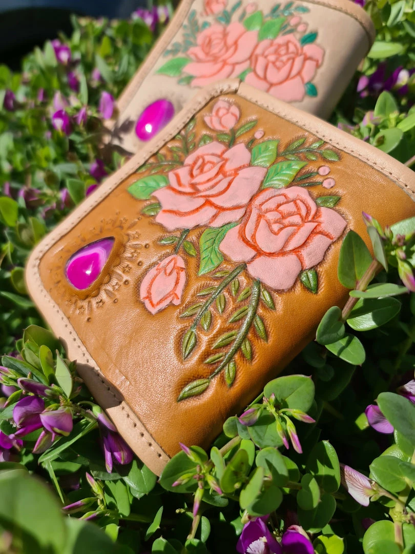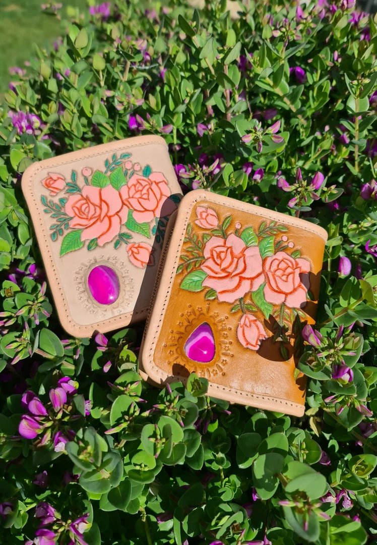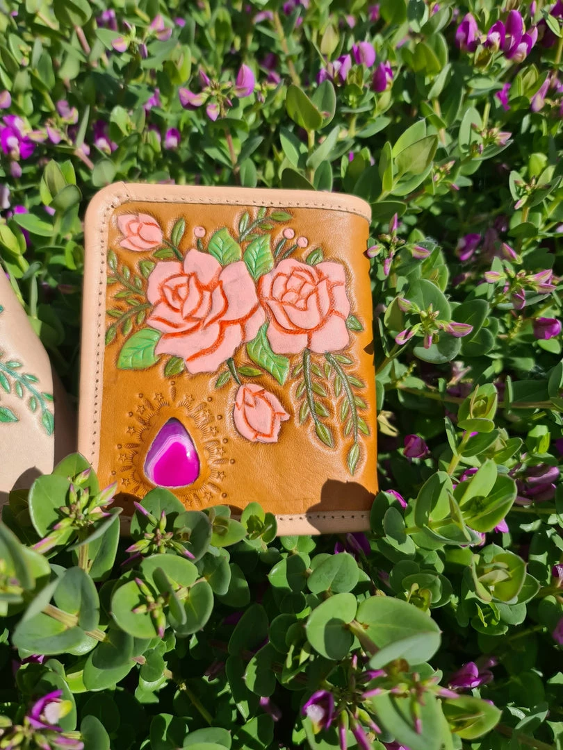 Our Beautiful new ‘Kissed By a Rose’ leather purse features our exclusive new Hand painted Roses and a Pink Agate stone. This bohemian purse ticks all the boxes with room for all your cards and cash. This boho purse is a limited addition and we will not be bringing it back after its gone.Â