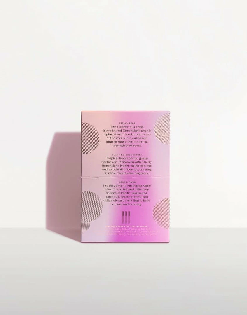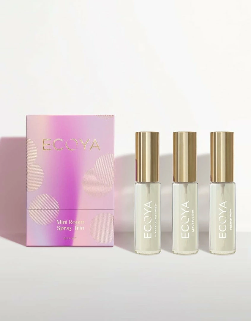 Three 30mL Room Sprays, each fragranced in one of our most loved ECOYA fragrances; Guava & Lychee Sorbet, Lotus Flower, French Pear.