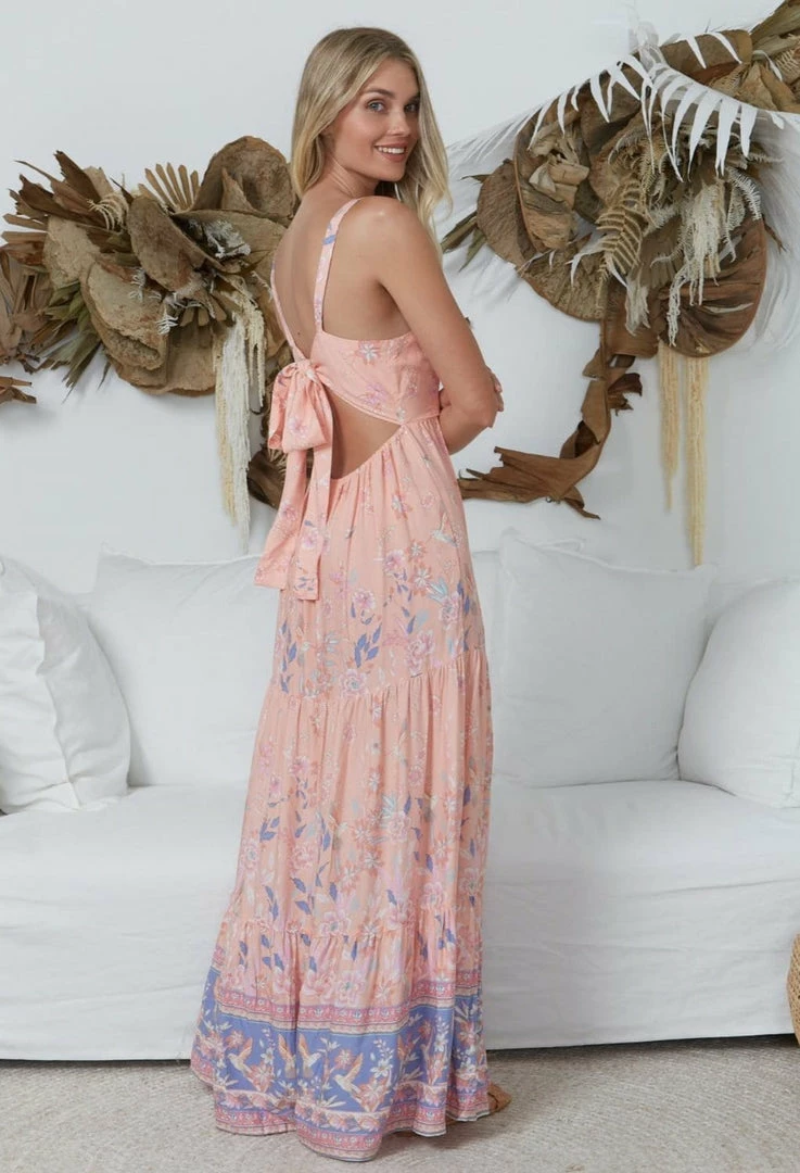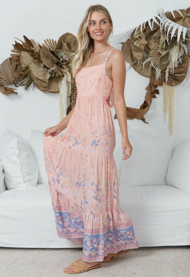 To our coastal loving boho babes, this dress was made for you! The beautiful ‘Dalia Strappy Dress’ features a beautiful peach pattern, a maxi length, tie up back detailing, a fitted bodice and, thick straps back tie detailing.Â