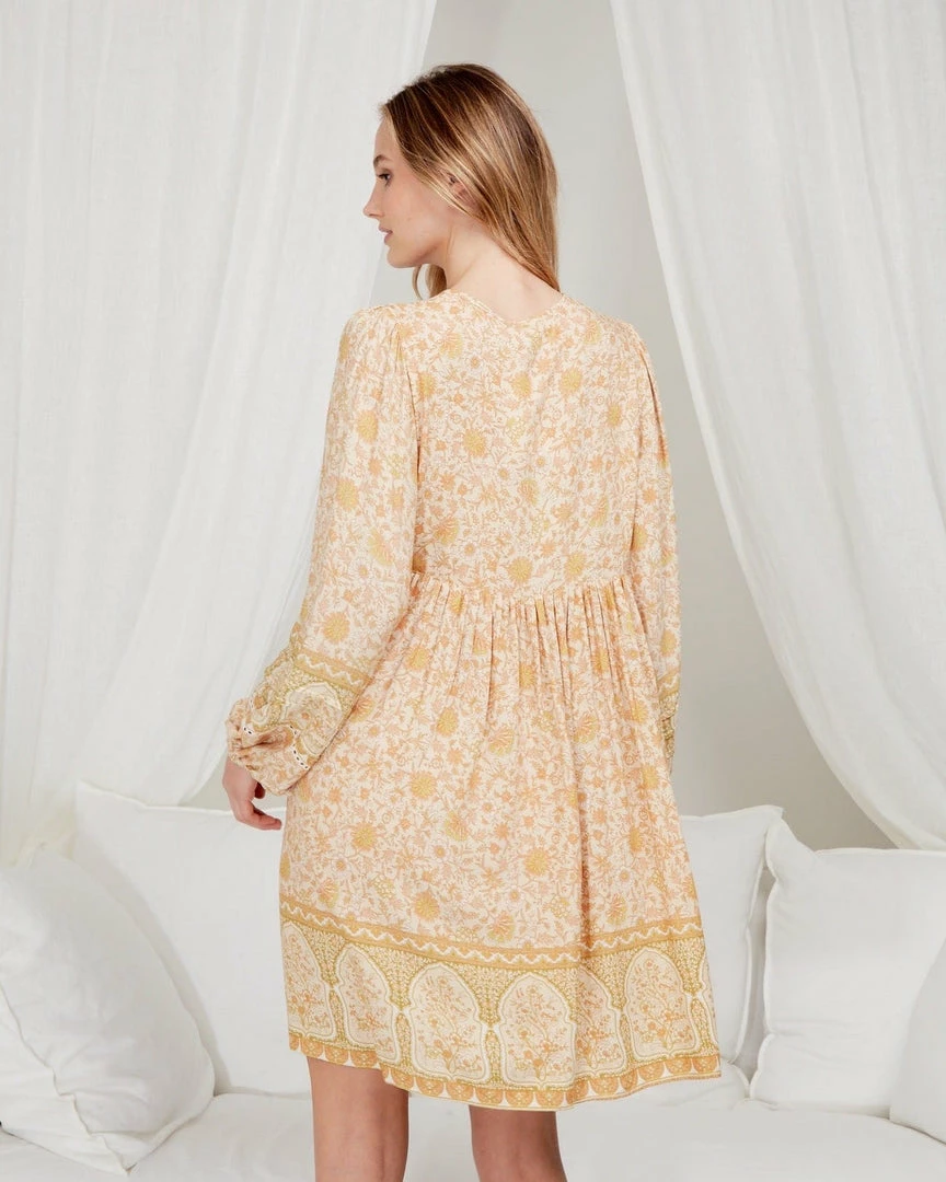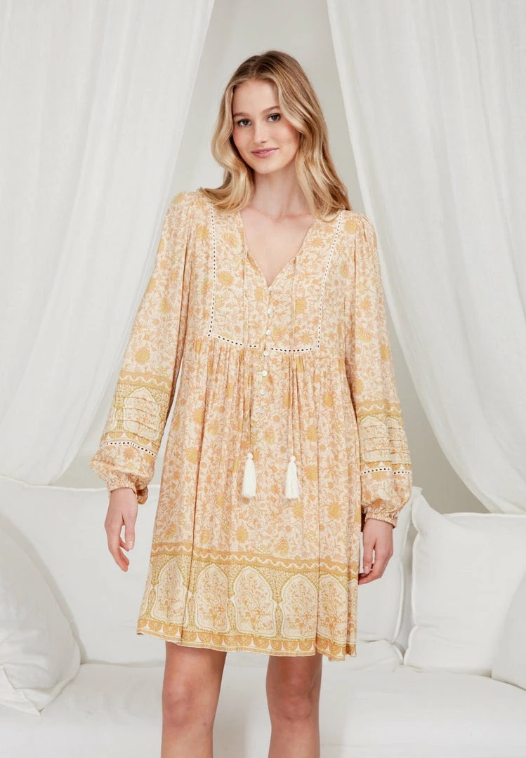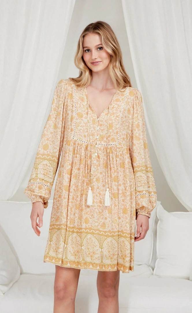 Boho babes, let’s keep this short and sweet – the Nylah Dress is your new fave style. Show off your inner goddess with this gold and beige floral print!