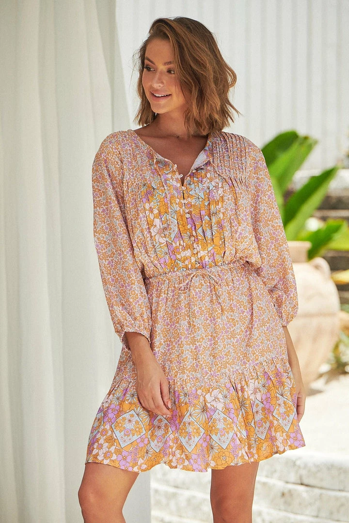 The ‘Asa Mini Dress’ is our newest obsession- and we hope it will be yours too! It features a orange tone with a multi floral print, ruched detailing, long sleeves, mini length, fitted waist and a relaxed flowy skirt.