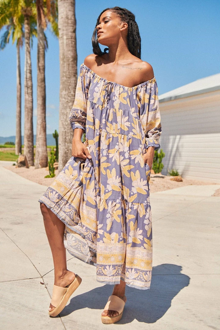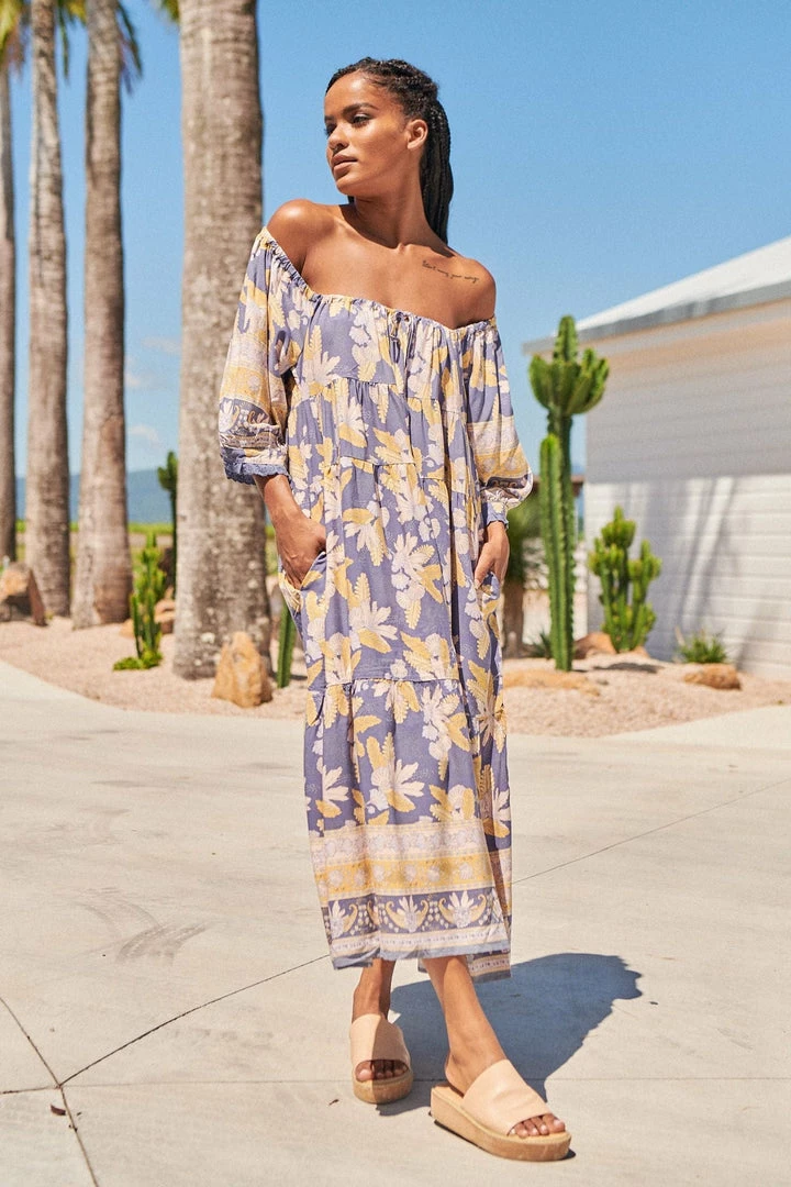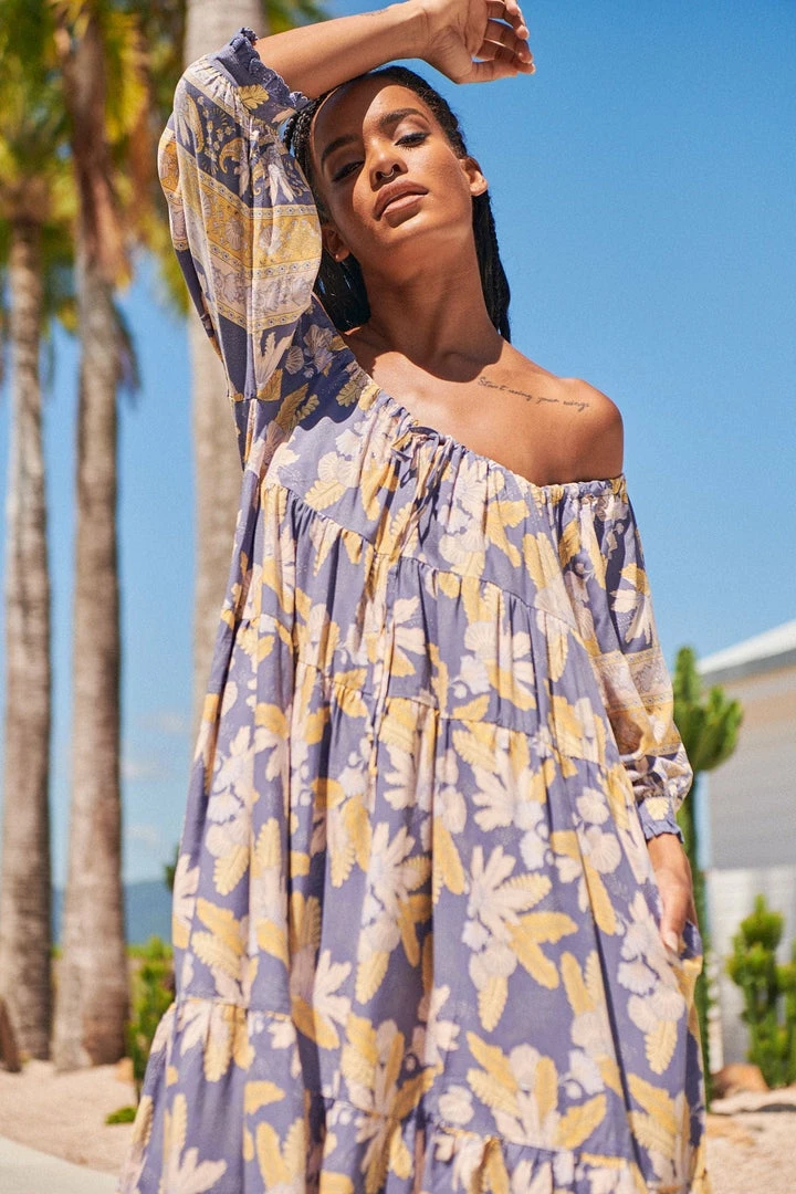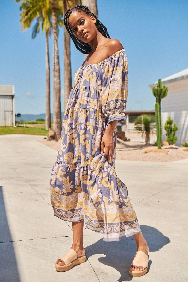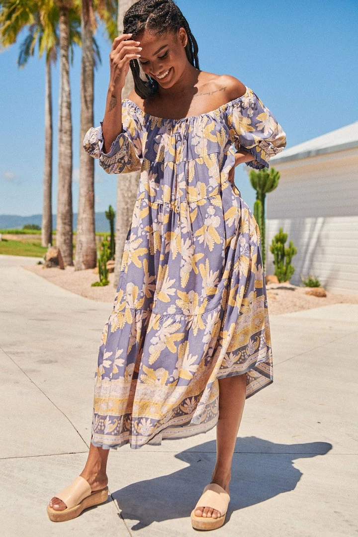 The ‘Blossom Midi Dress’ in ‘Ray’ is a wardrobe staple this season! It features a beautiful purple and floral print perfect for Autumn, midi length, Long raglan puff sleeves and an oversized fit.Â