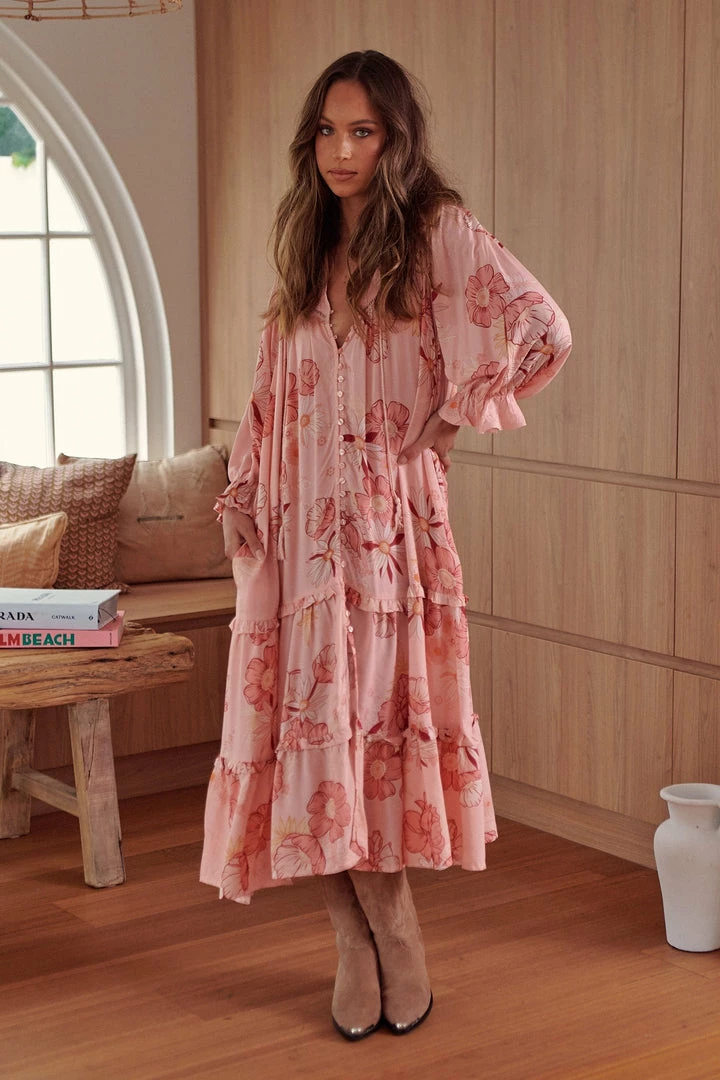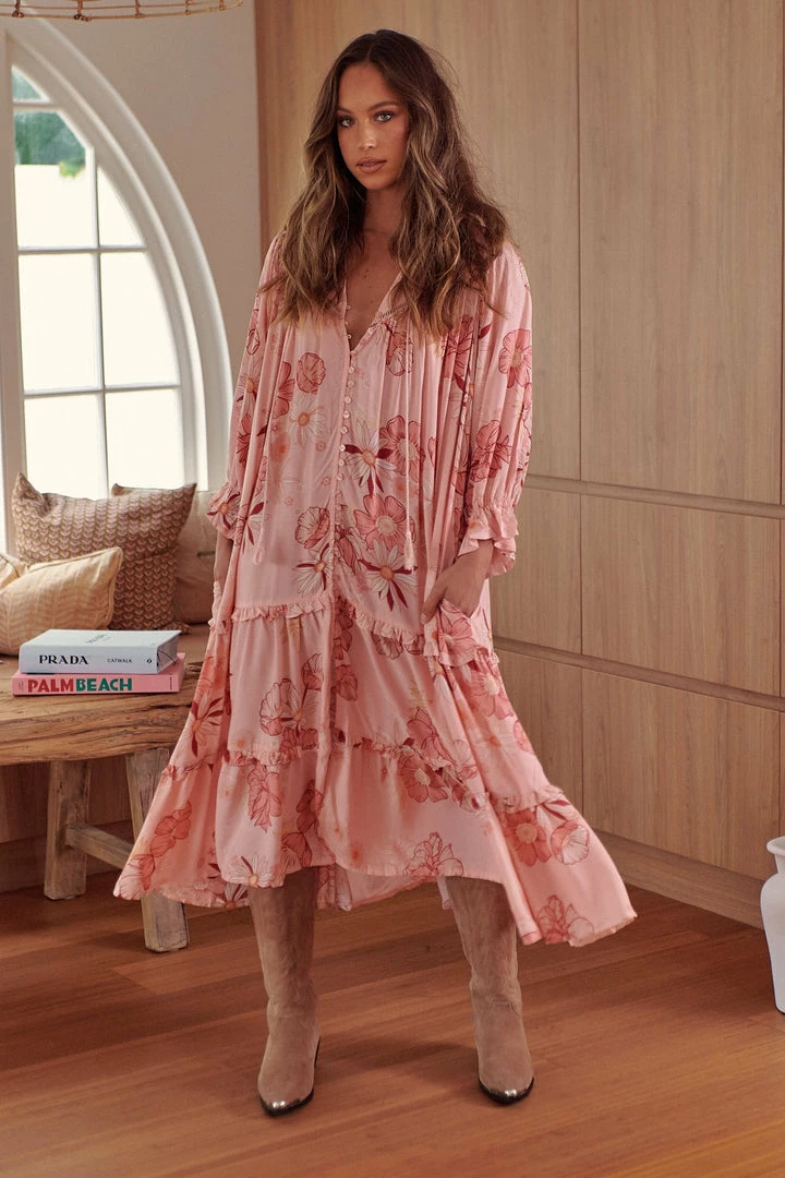The Latest Jaase Midi Dress ‘Briana’ features a button through front with detailed shoulder yoke with ladder lace details and pin tucks to give extra shape through the shoulders and bust line. The midi skirt has hidden side pockets and a double skirt flounce frill with frill details. Fall in love with this beautiful bohemian midi dress in pink.Â