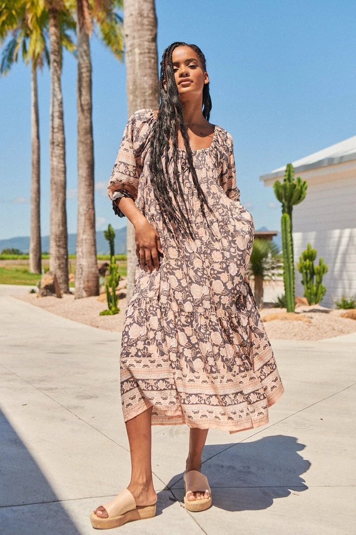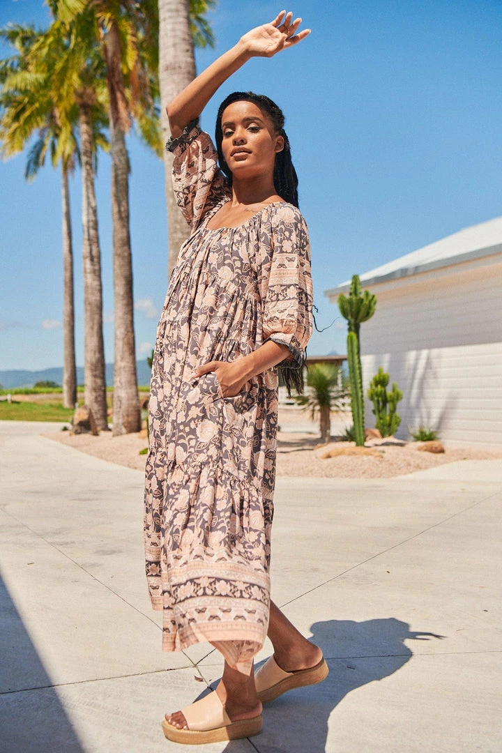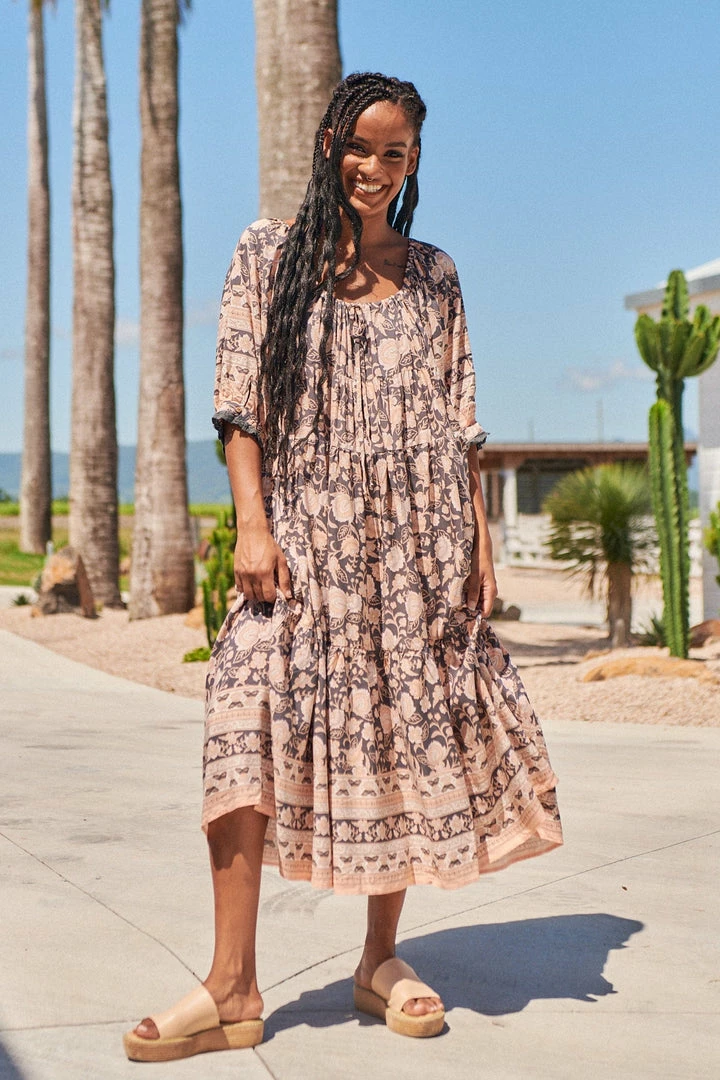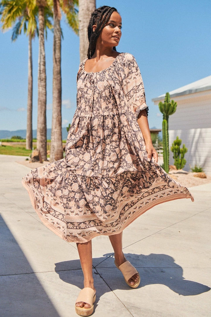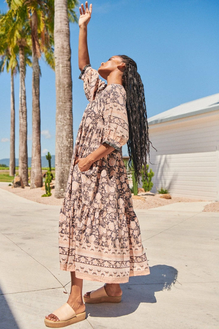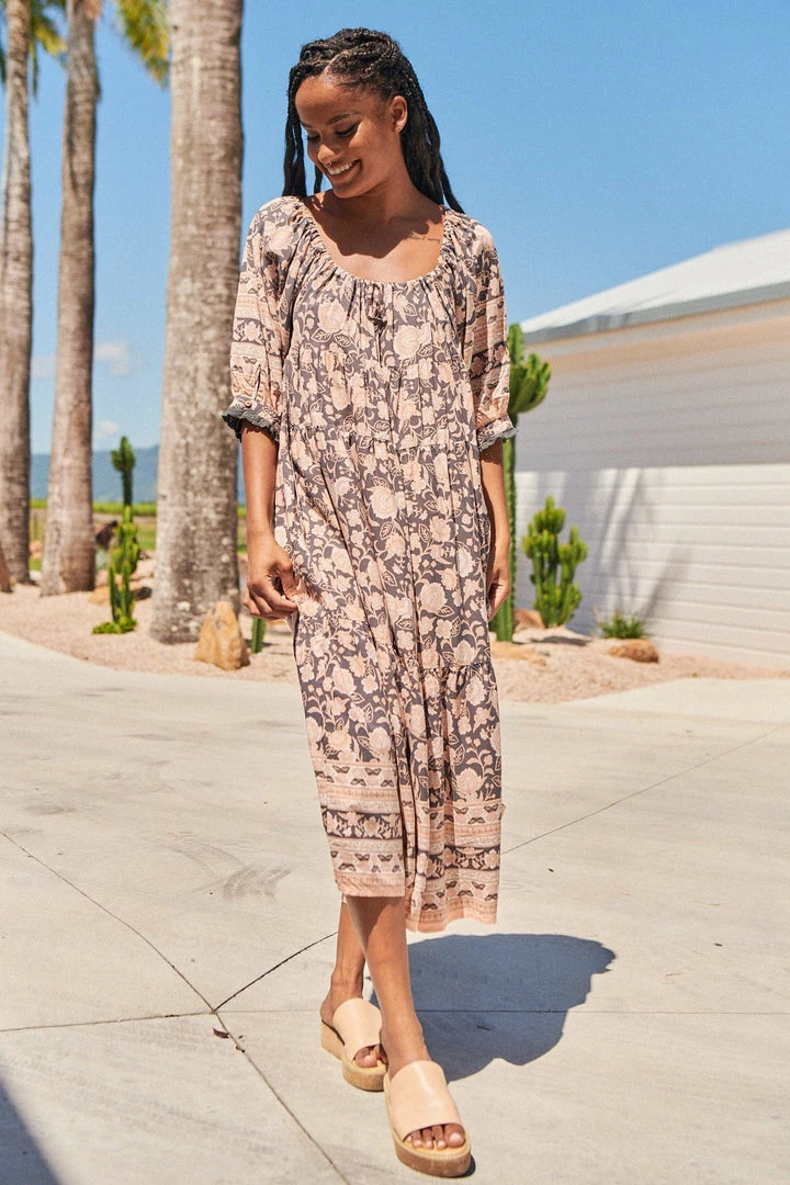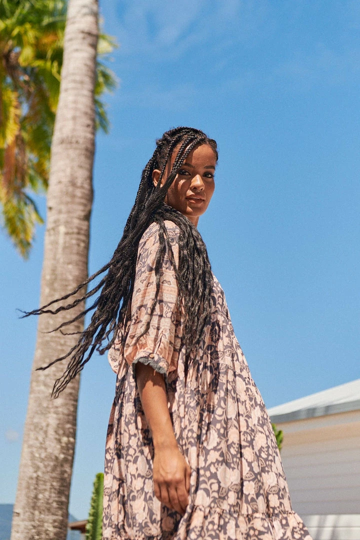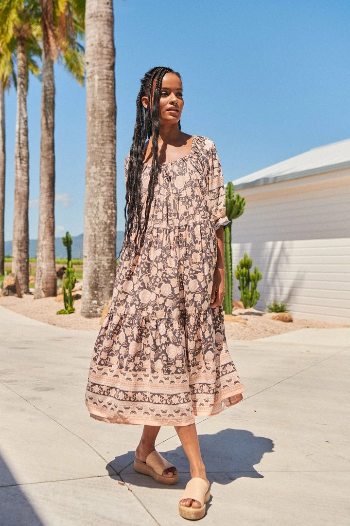 The ‘Blossom Midi Dress’ is a wardrobe staple this season! It features a multi earth toned floral print perfect for Autumn, midi length, Long raglan puff sleeves and an oversized fit.Â