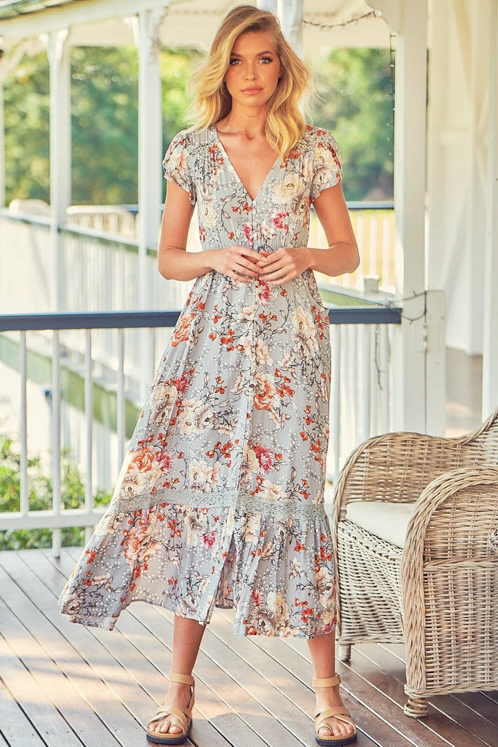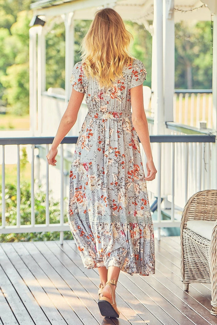 The ‘Carmen Dress’ is perfect for any season in the ‘Orange Blossom’ print and fresh colourful tones. It features a maxi length, short sleeves, v neckline, crochet detailing on shoulder and frilled hemline and a drawstring around the waist.Â