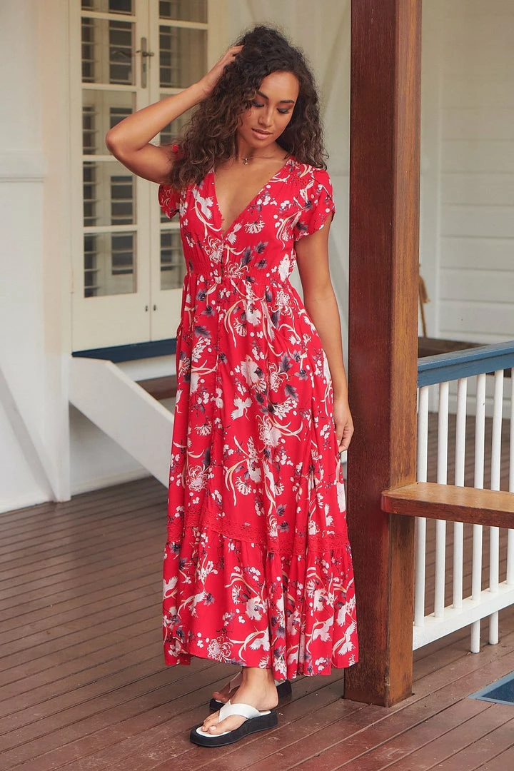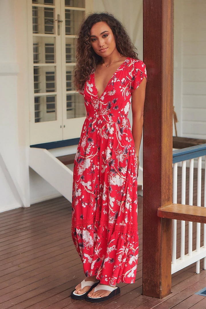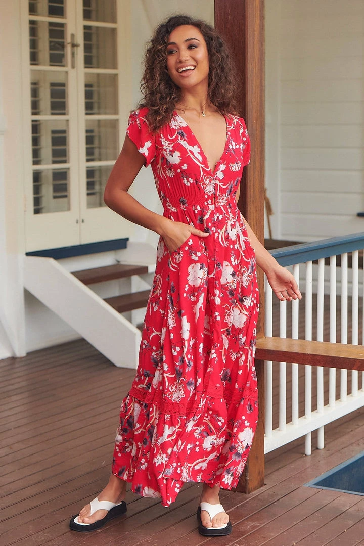 The ‘Carmen Dress’ is perfect for spring with its ‘Rene’ print and fresh Red colourful tones. It features a maxi length, short sleeves, v neckline, crochet detailing on shoulder and frilled hemline and a drawstring around the waist.Â