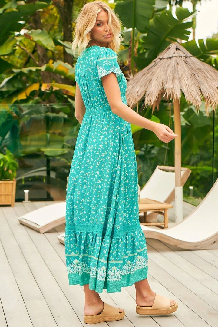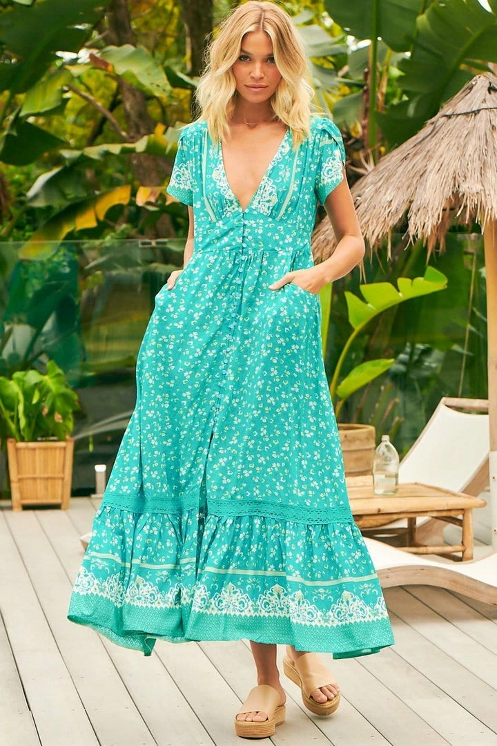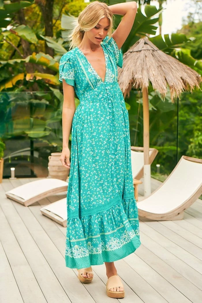 The most gorgeous relaxed coastal inspired maxi, featuring a teal tone, plunging v-neckline, button top (Perfect for breast feeding mothers), side pockets, and leg slit. The ‘Tabitha Maxi’ speaks for itself, so pair with some simple gold accessories and tan mules!Â