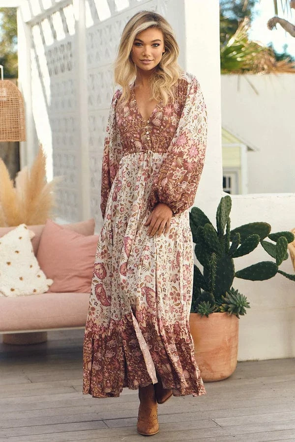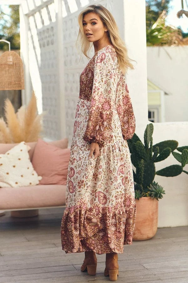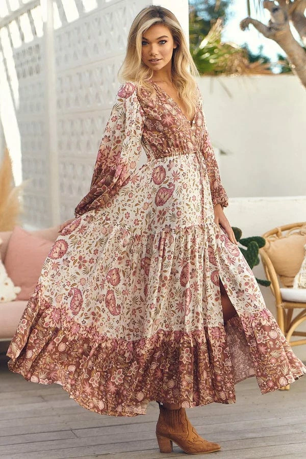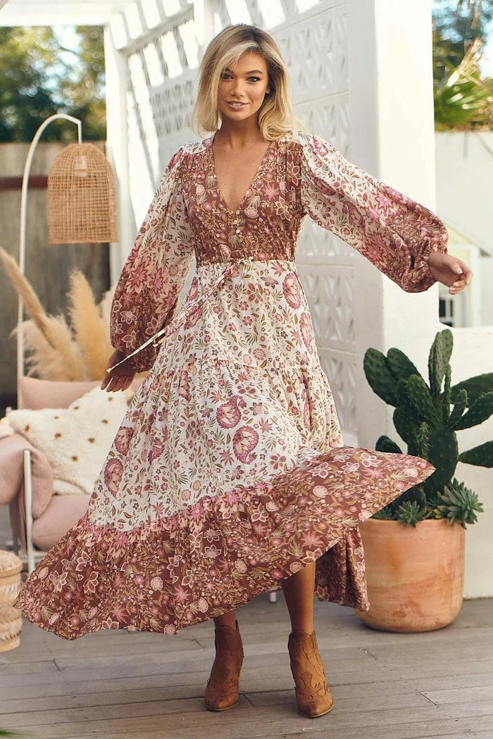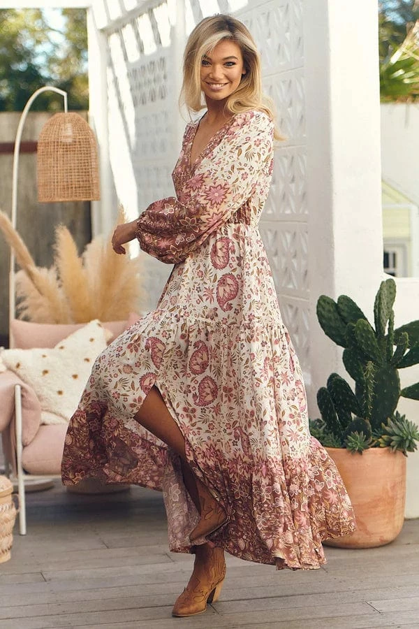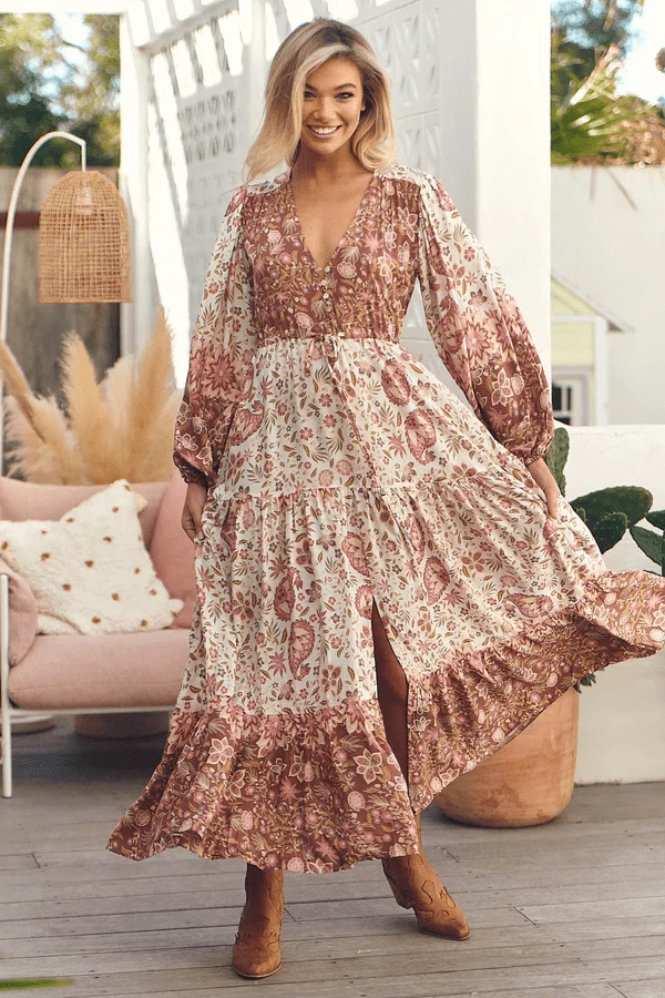 Go from a day at the beach, to dinner and drinks seamlessly with our new ‘Teresa Maxi Dress’ by Jaase Clothing. This beautifully detailed floral boho maxi dress comes in a dreamy earthy pink colour palette and features a v neckline and a swishy silhouette for the most flattering all in one outfit.Â