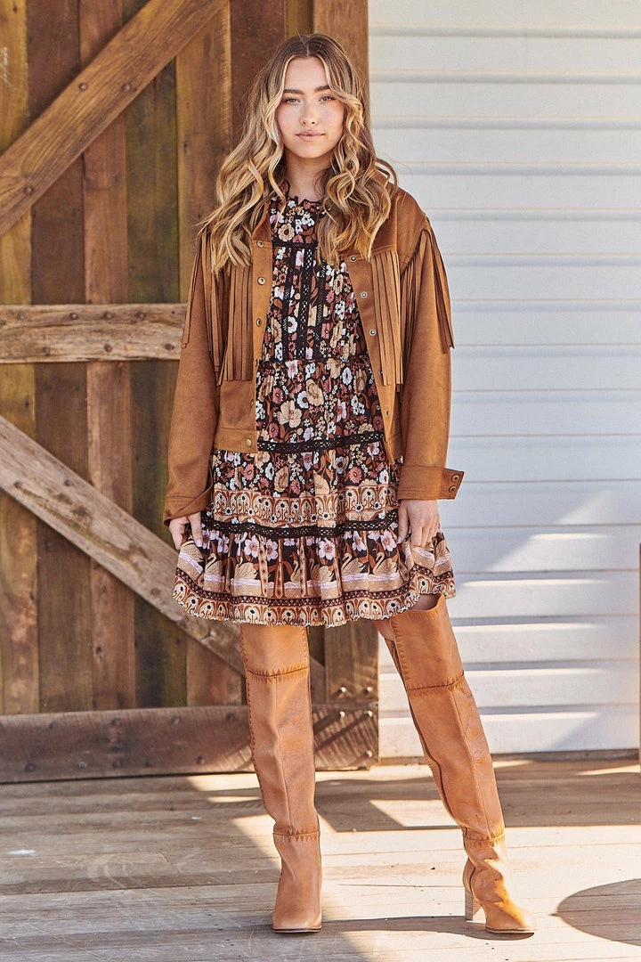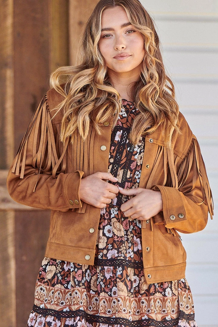 Who doesn’t love a bit of fringe detailing? Boho Western style, this timeless faux suede jacket from Jaase clothing is featured in a relaxed silhouette with press stud button front closure. That new-jacket feeling that you will want to layer over any boho maxi dress, bringing an edgier look with the fringe detailing for an added special touch.