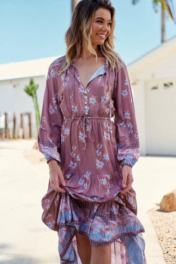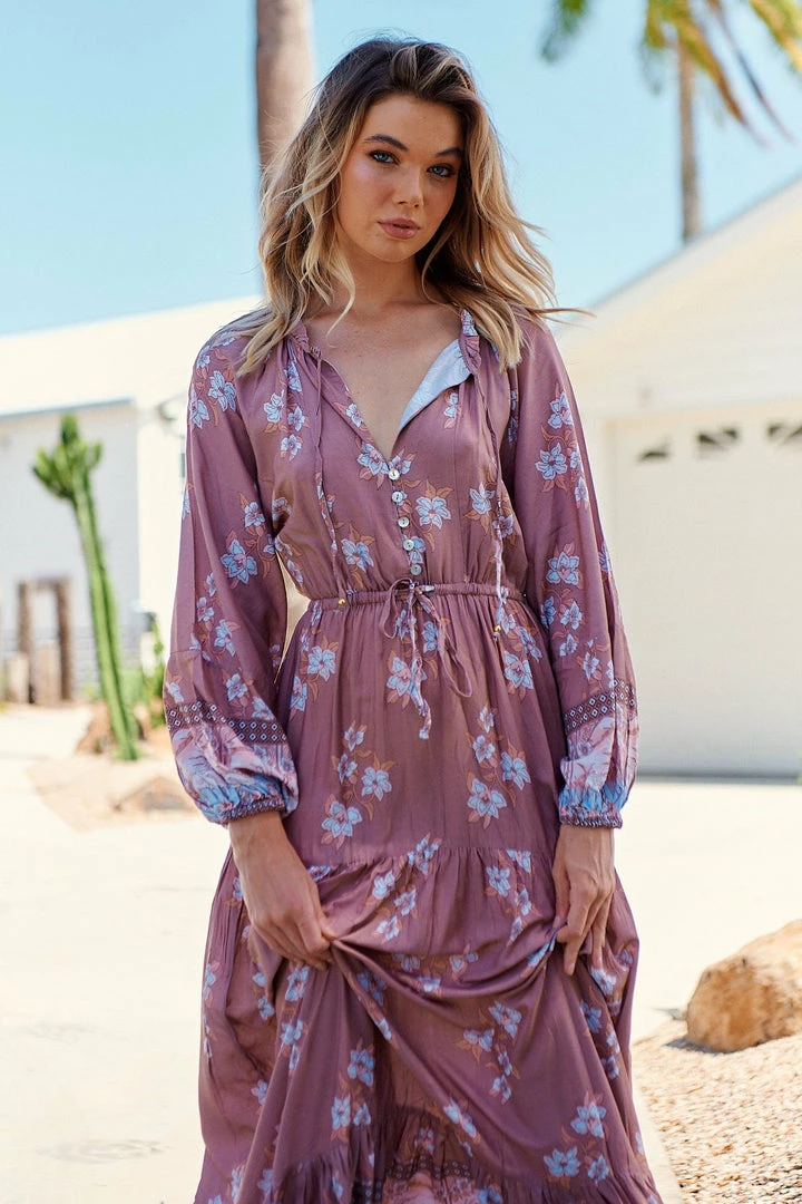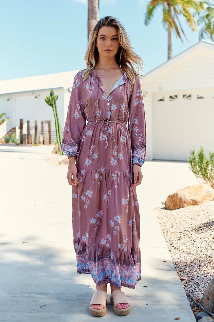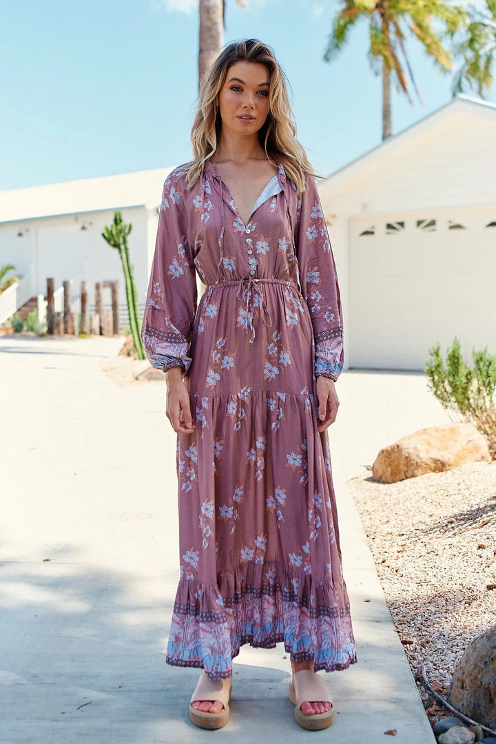 The perfect addition to any fun day-in-the-sun. The ‘Frankie Maxi Dress’ features a brown chocolate tone, maxi length, deep V-neckline, front tie detailing, long sleeves and a relaxed fit.