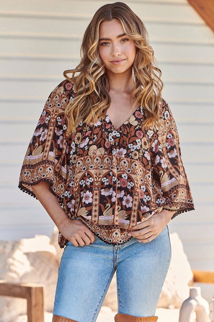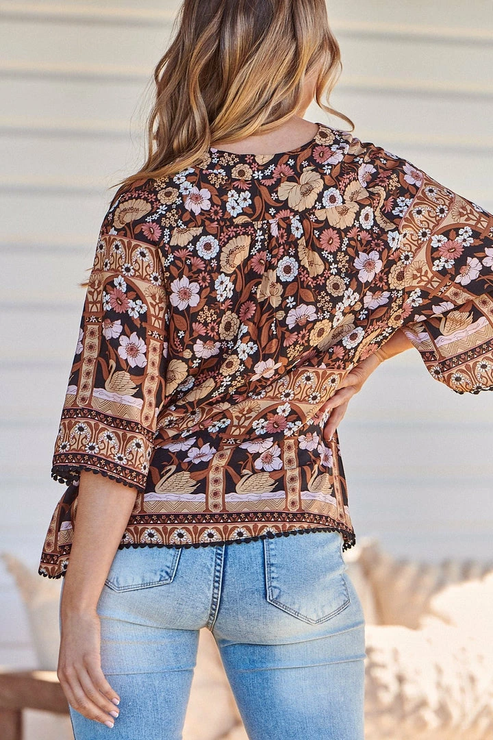 How can you not fall in love with ‘Gabriella’ The Top we all want in our wardrobe. This Boho Floral Blouse is a statement piece featuring a soft buttery rayon material in a oversized bright floral boho blouse, crochet scallop trim and a three quarter lantern sleeve.
