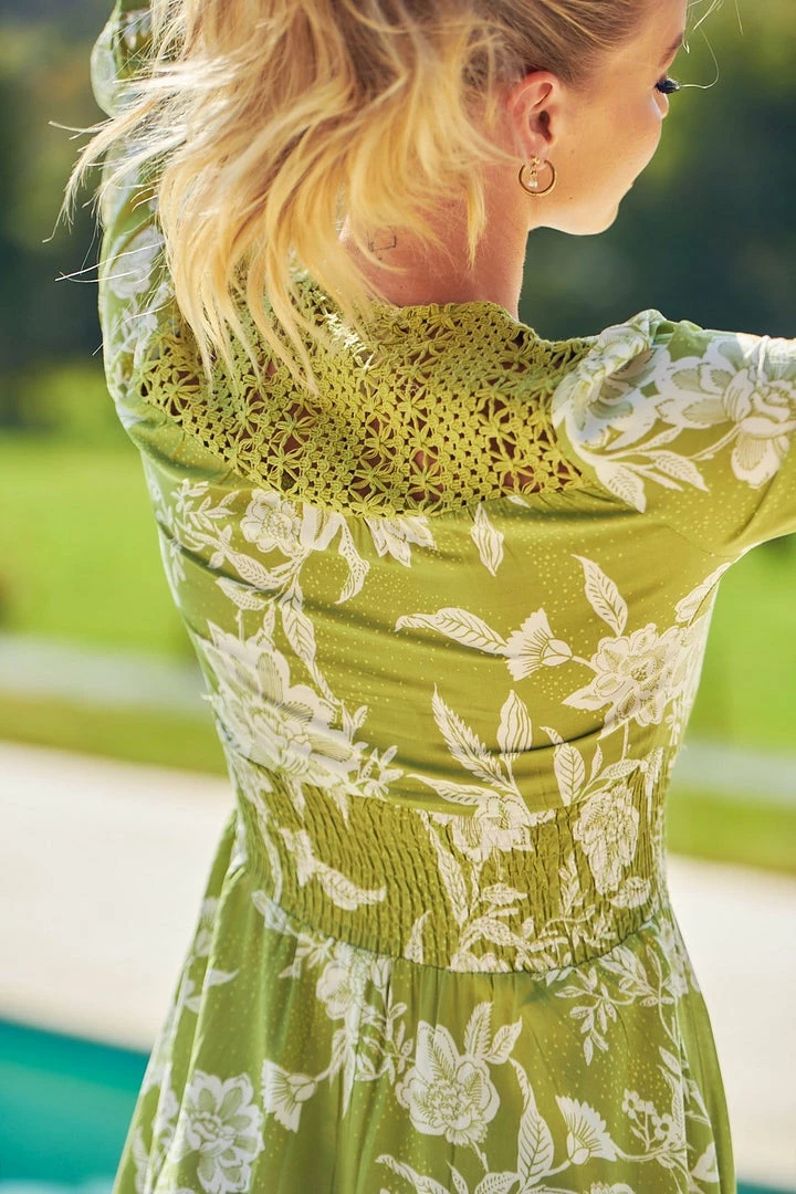 We have found the perfect bohemian Maxi Dress! Introducing the ‘Indiana Maxi Dress in ‘Midori’ by Jaase. Featuring a beautiful floral print with a beautiful Green tone and a crochet panel detailing on the back of the shoulders! She will be on high rotation in any boho lovers wardrobe!Â