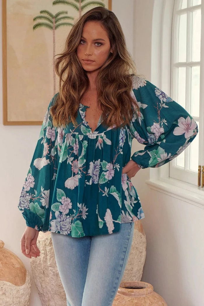 Fall in love with the latest boho blouse from Jaase featured in a babydoll-inspired silhouette and bold, exclusive Australian designed print for the most special way to add dimension no matter the season. Pair back with jeans and sneakers for a casual Sunday look, perfect for taking the kids to the park.Â