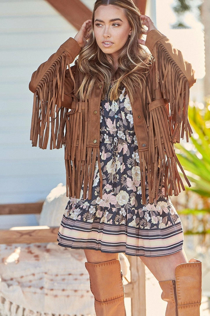 Who doesn’t love a bit of fringe detailing? And the ‘Nomad Jacket’ has so much fringe! Boho Western style, this timeless faux suede jacket from Jaase clothing is featured in a relaxed silhouette with press stud button front closure. That new-jacket feeling that you will want to layer over any boho maxi dress, bringing an edgier look with the fringe detailing for an added special touch.