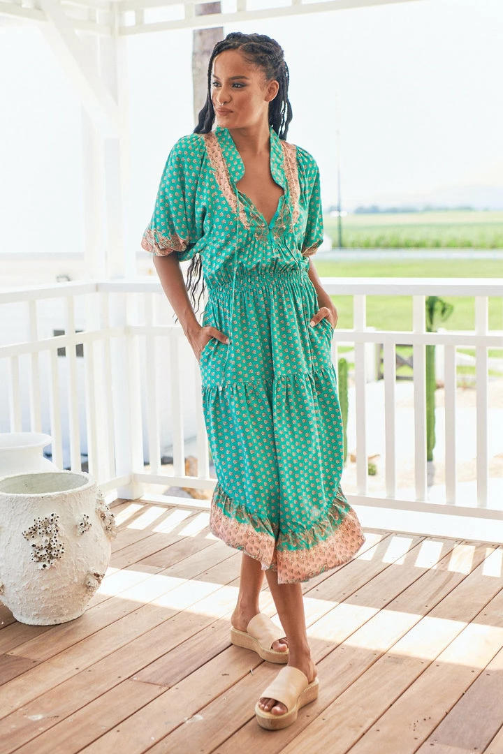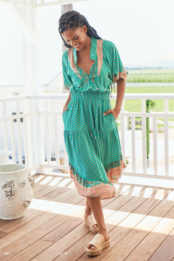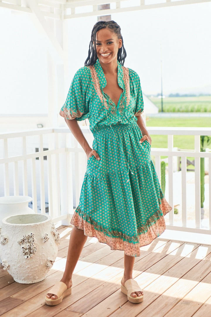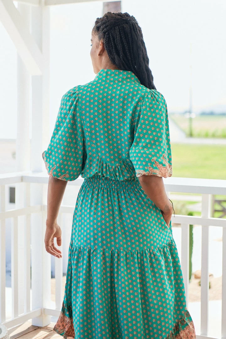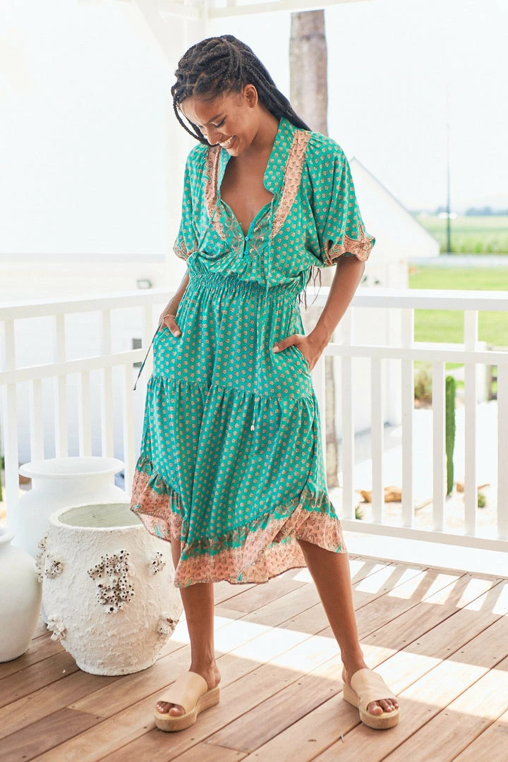 Fall in love with the Effortlessly stunning midi dress! This must-have high low midi dress is featured in a billowy style with extravagant yoke neckline with puffed sleeves and flattering elastic waist line for added dimension.