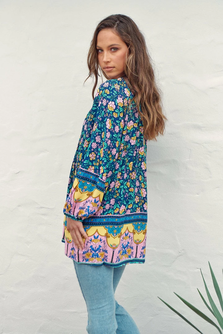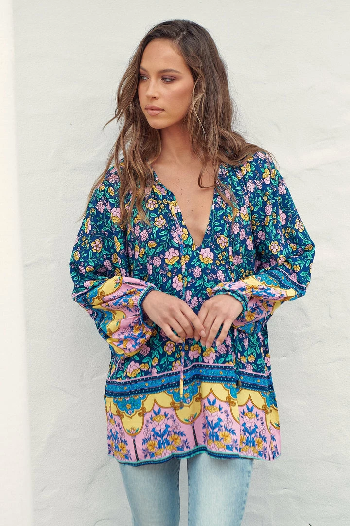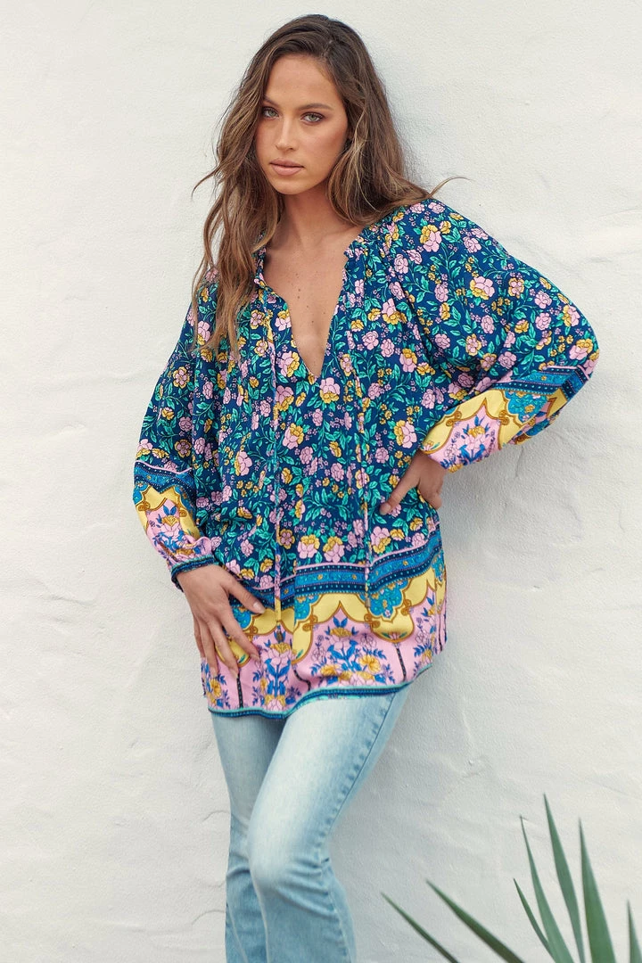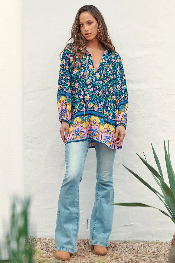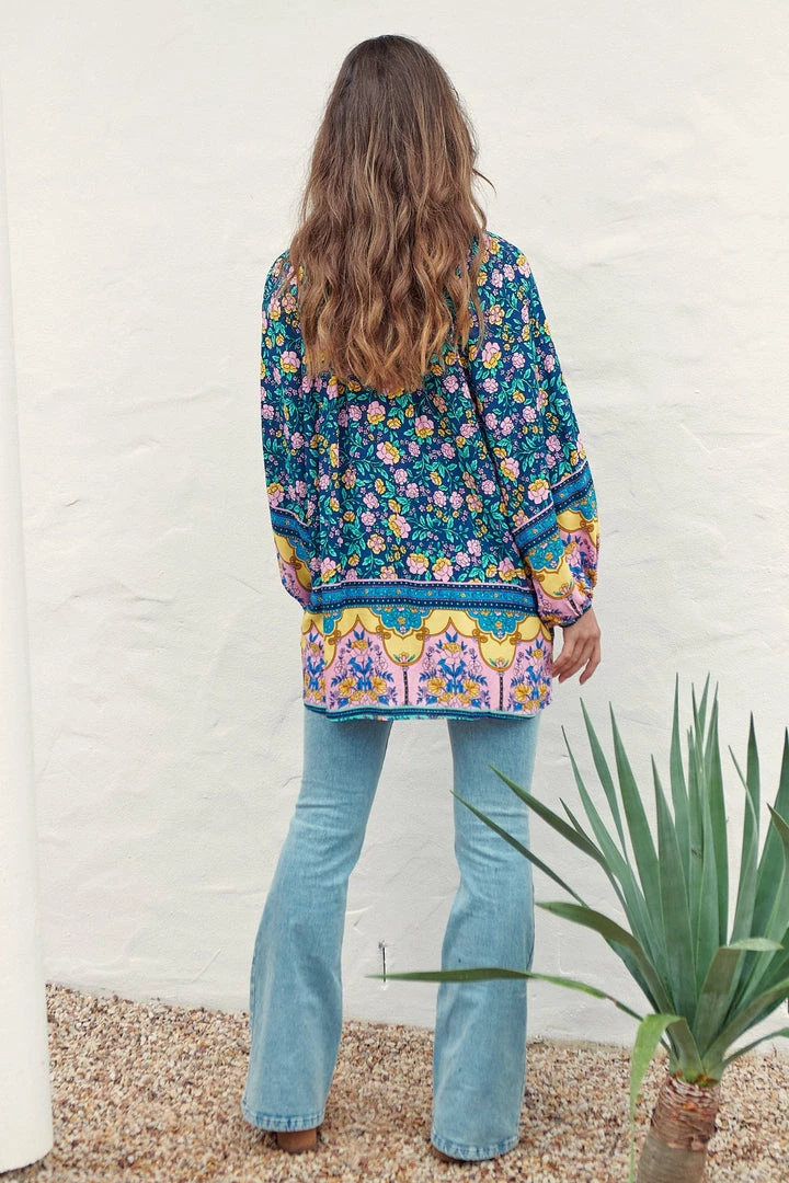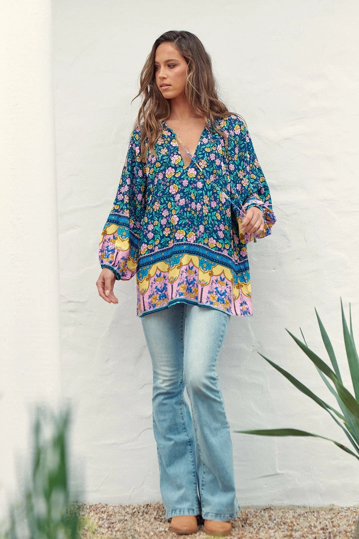 Give the ultimate boho girl vibes this season in our latest obsession; The ‘Kellie Top’! Featured in the latest ‘Posy’ Collection by Jaase clothing. This boho blouse features a blue tone with bright floral and boho border print & a relaxing flowy fit.Â