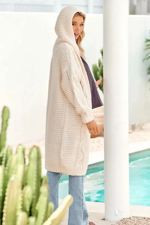 The ‘Cinnamon Knit Cardigan (Ivory)’ is the perfect styling knit to throw over all of your pretty femme inspired outfits in the cooler season. This cardi features an intricately patterned knit material, long sleeves and is hooded.Â