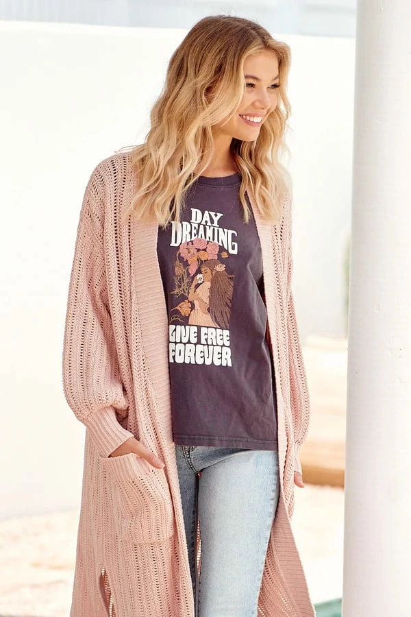 Perfectly oversized for the most comfortable fit, the new ‘Elyse Knit Cardigan’ features a gorgeous textured strawberry knit material, long balloon styled cuffed sleeves, a longline style, front pockets, midi length and is a relaxed fit.Â