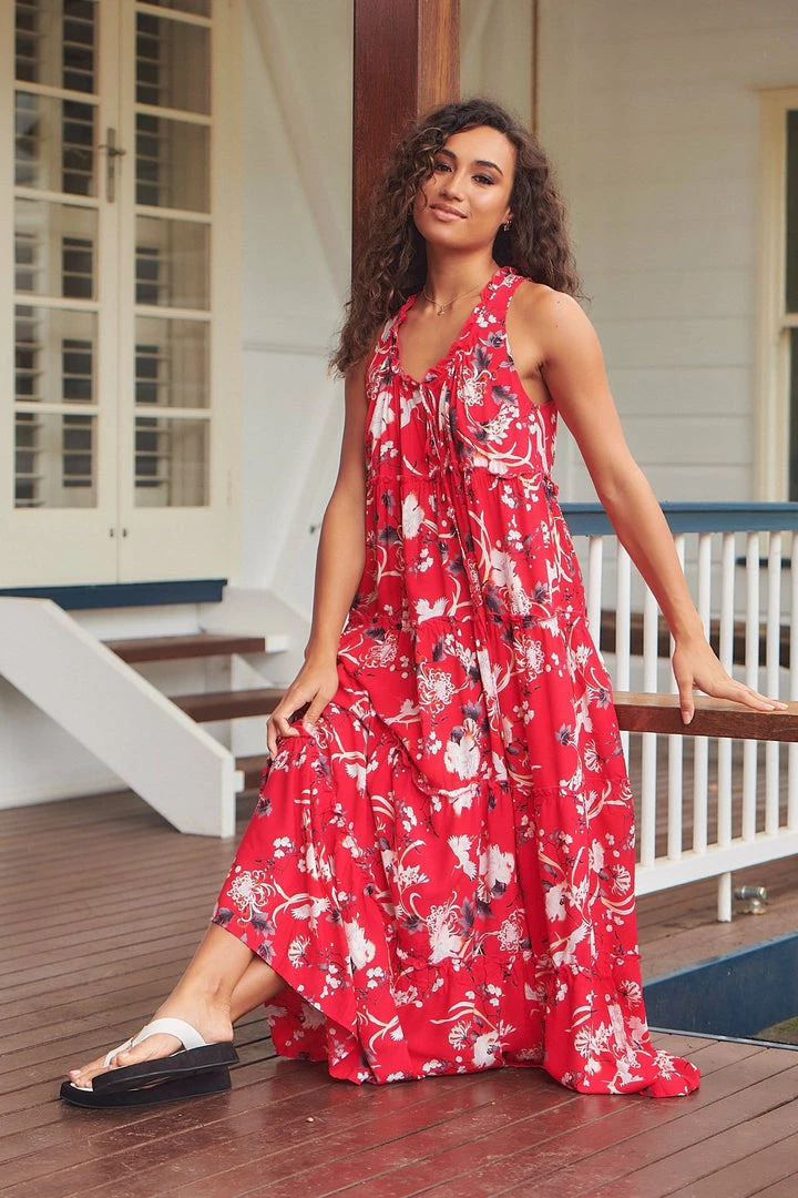 How dreamy is the ‘Erryn Maxi Dress’?! Now in a beautiful red tone, it features a maxi length, Drawstring around neckline and a relaxed oversized fit. This dress styles perfectly with dainty gold jewellery, nude sandals and a beautiful beige bag.Â