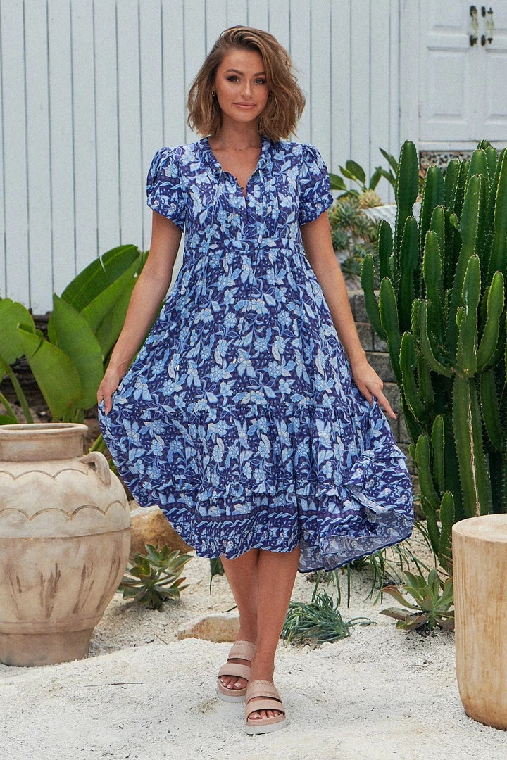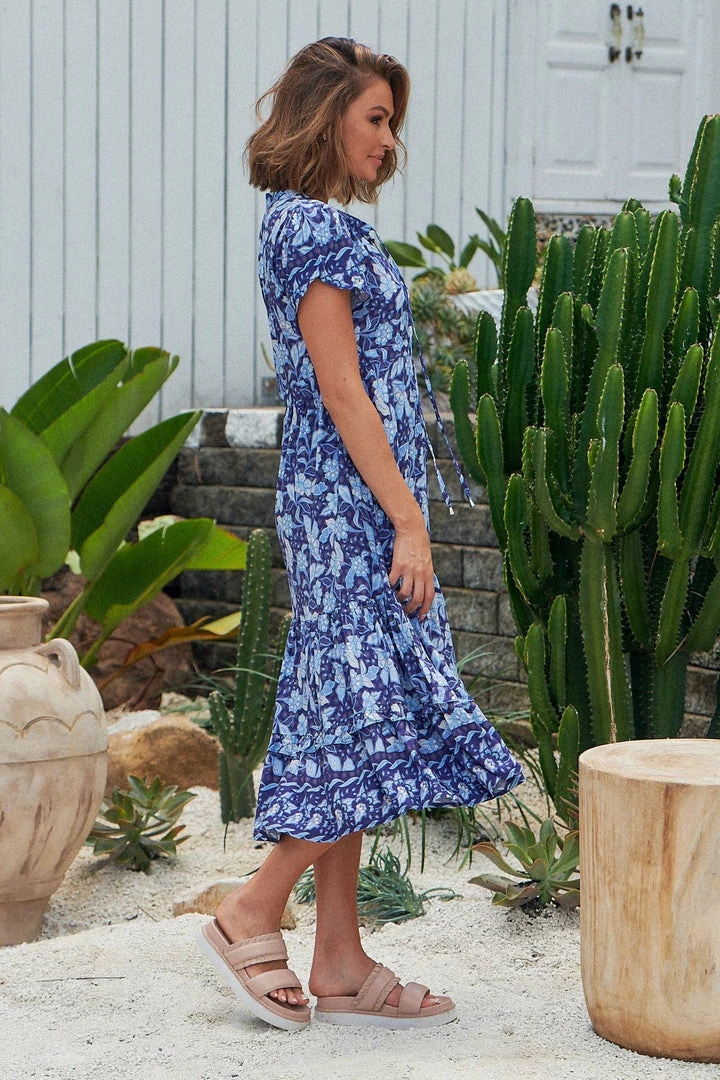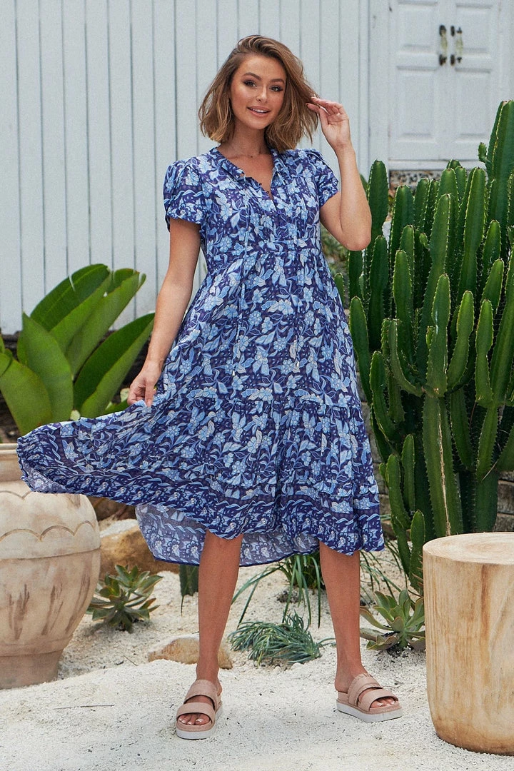 The ‘Nella Midi Dress’ is a wardrobe staple this season! It features a blue floral print perfect for the trans-season, midi length, short sleeves and slimline loose fit silhouette.Â