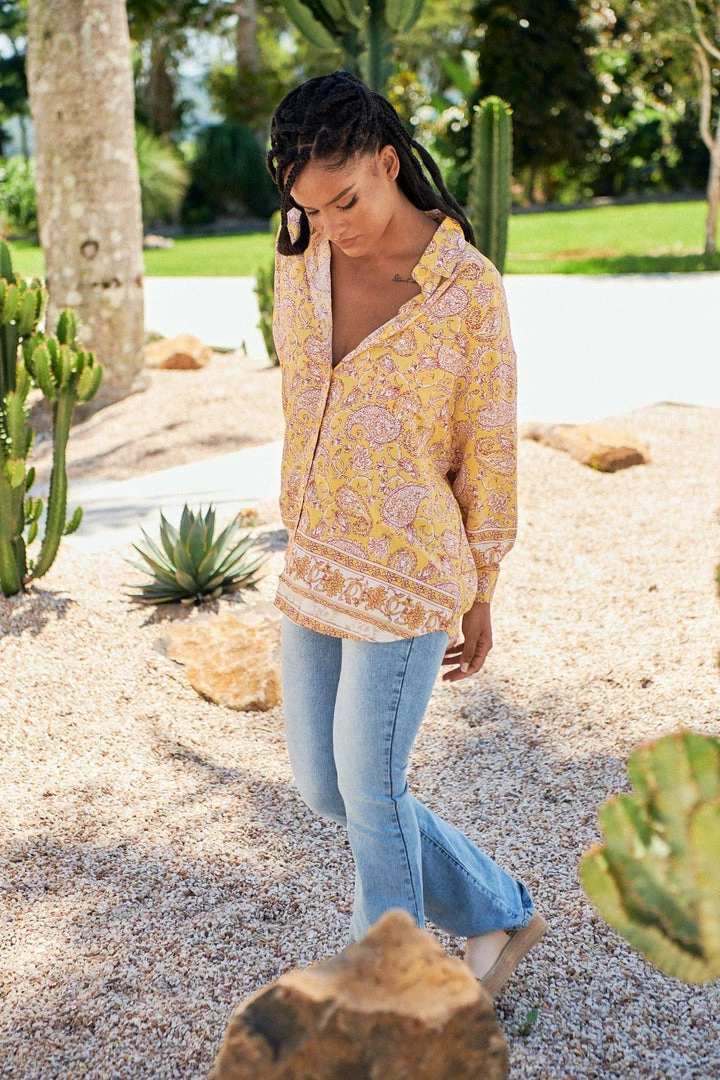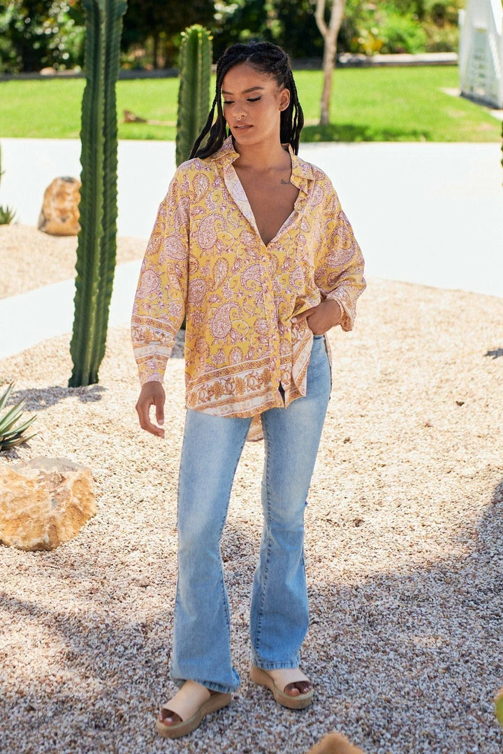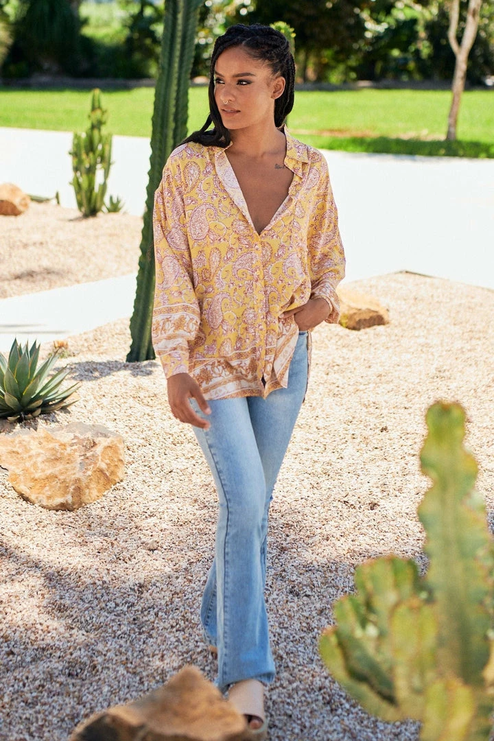 Stylish shift to add to your Autumn collection. The ‘Novella Blouse’ is a beautiful yellow toned top featuring a low v-neckline, subtle collar, front buttons, long sleeves with cuffs, a soft style material and a super relaxed fit.