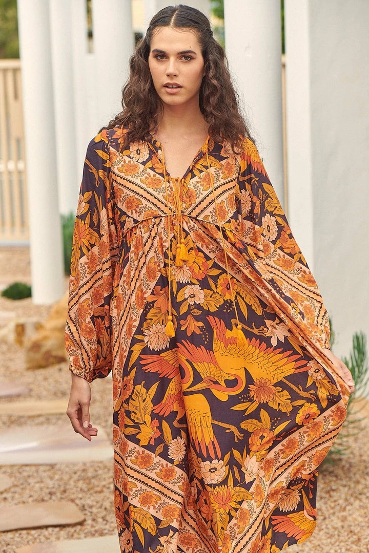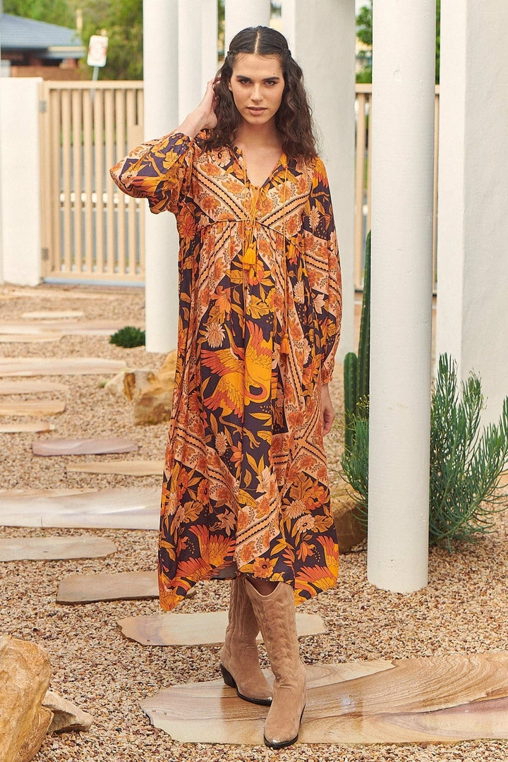 Fall in love with this effortless boho midi dress from the ‘Lantana’ collection features a stunning earthy tone and birds. This free flowing shaped midi features tie front detail and balloon cuff sleeves for added shape.
