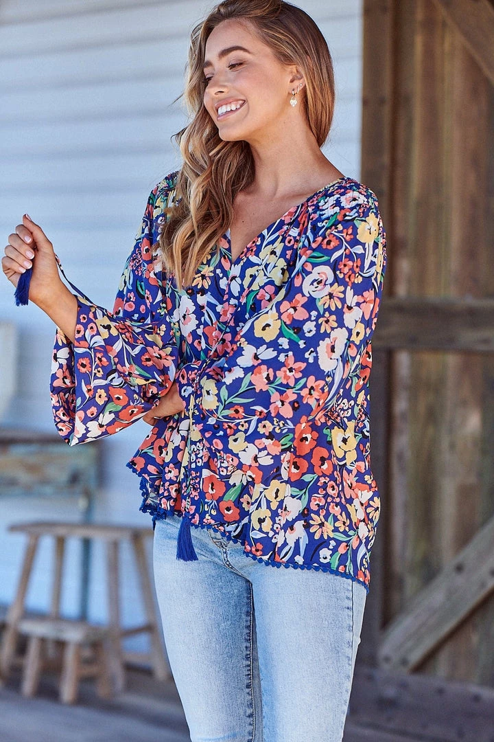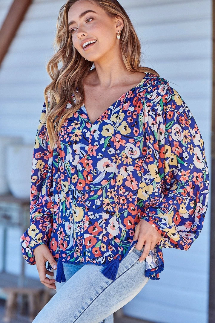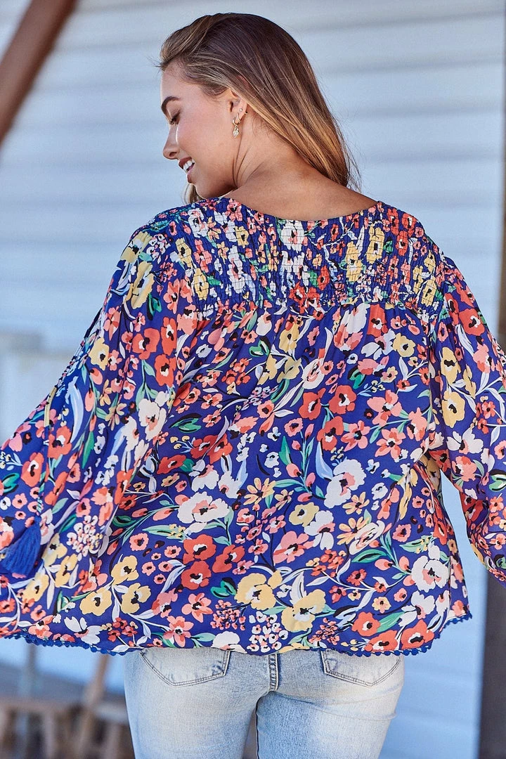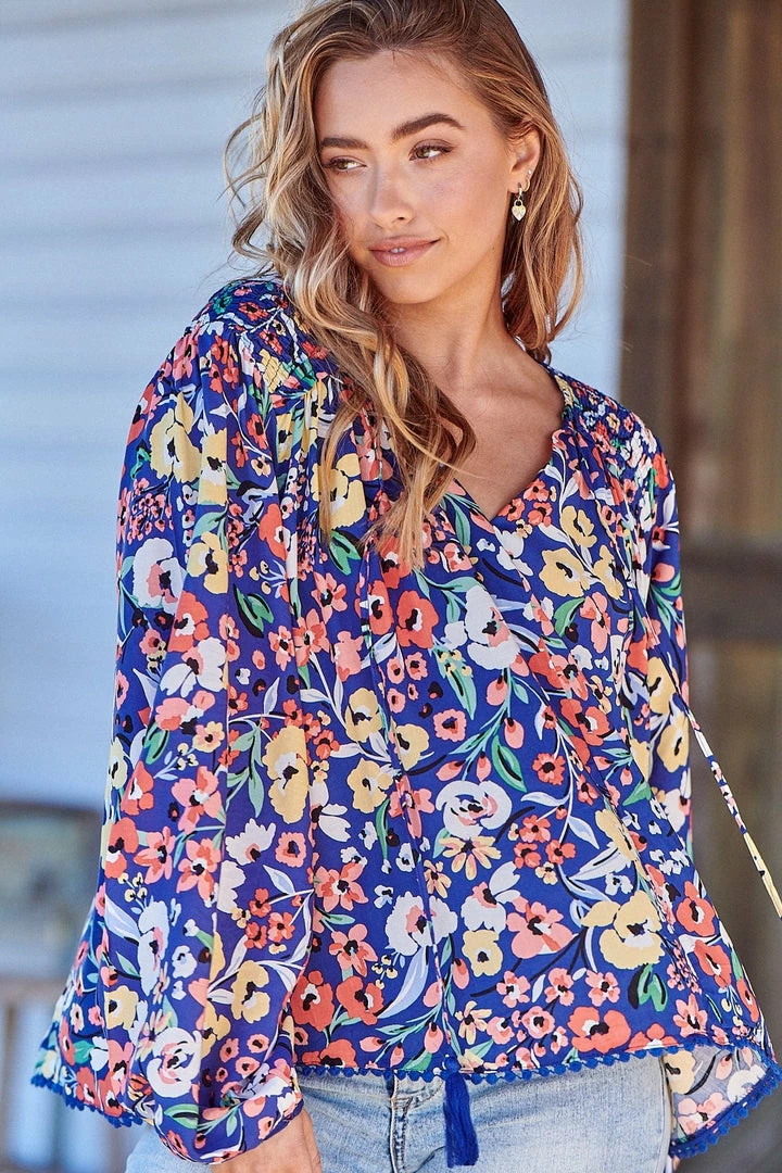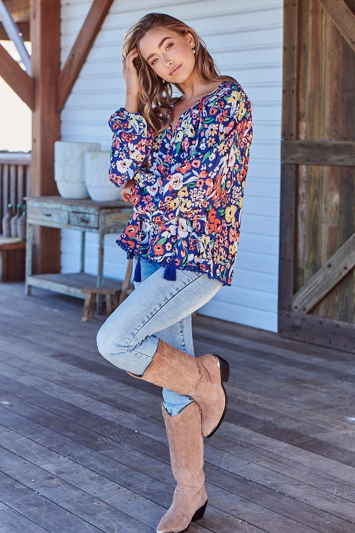 The perfect boho top for all the boho girls! The ‘Rue Top’ in ‘Carnation’ print features long sleeves with elastic cuff, Tassel ties at neckline and a relaxed fit.Â