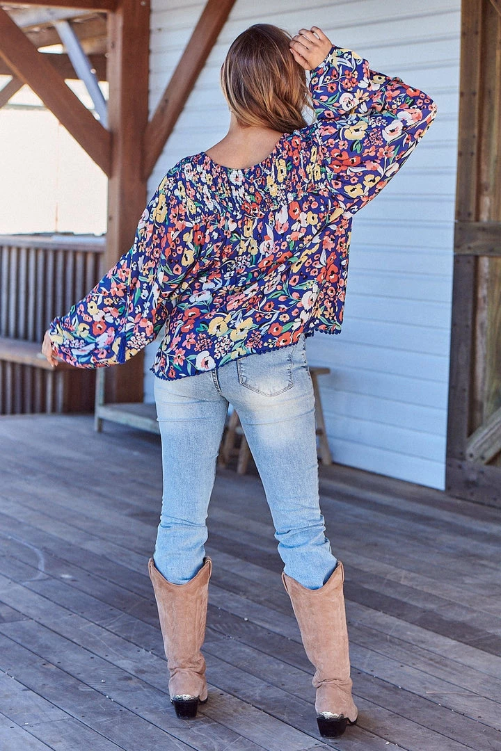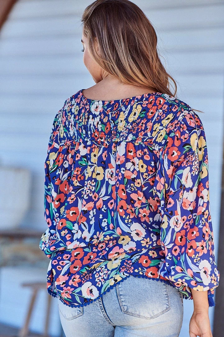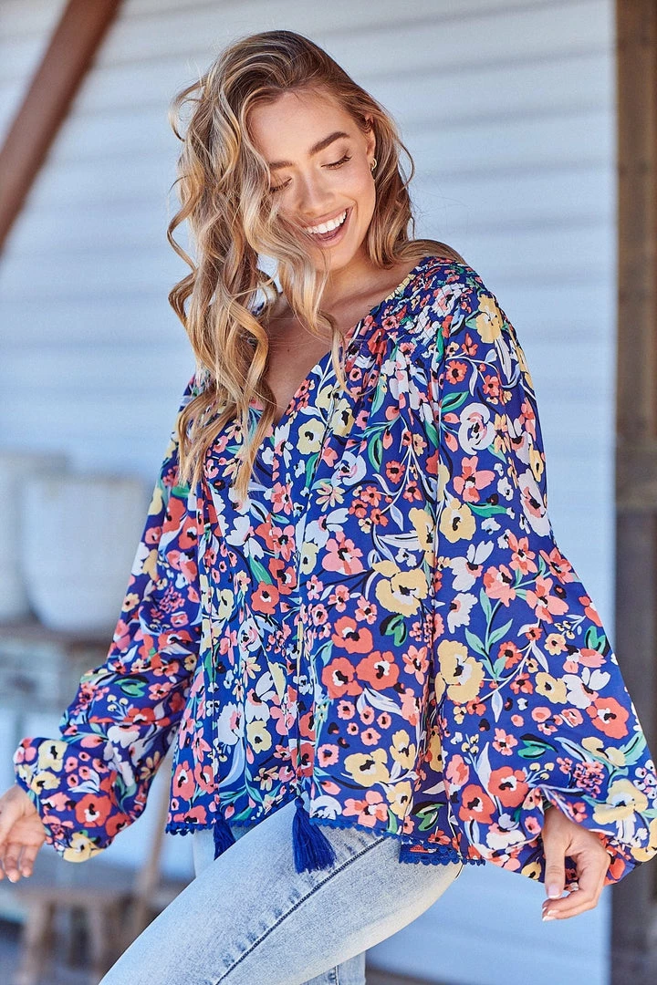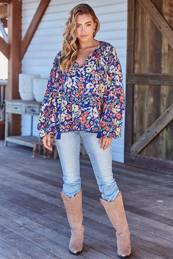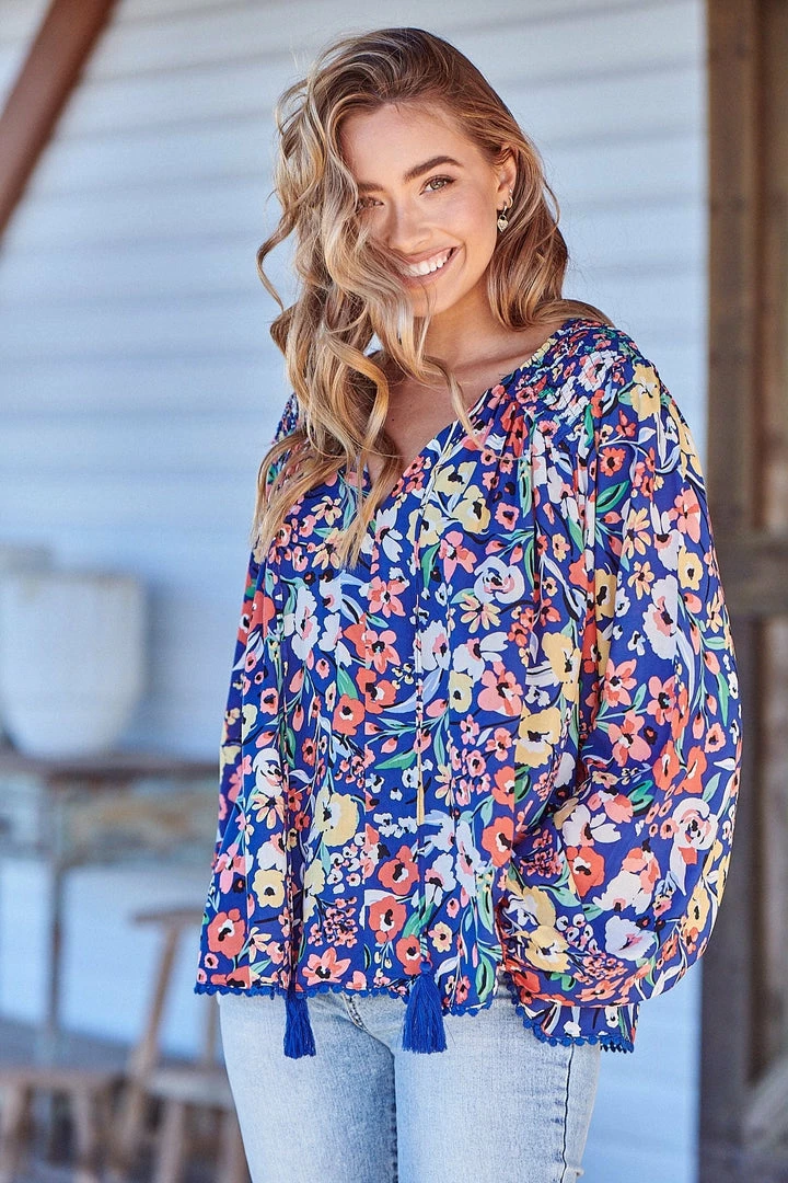 The perfect boho top for all the boho girls! The ‘Rue Top’ in ‘Carnation’ print features long sleeves with elastic cuff, Tassel ties at neckline and a relaxed fit.Â