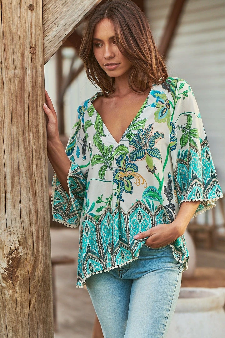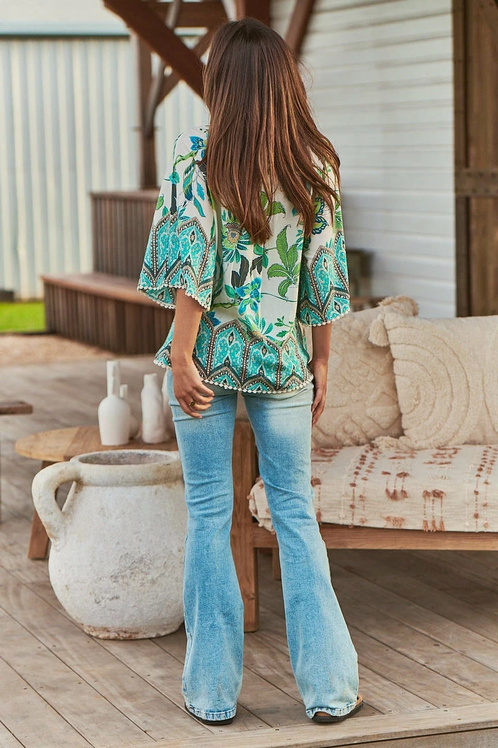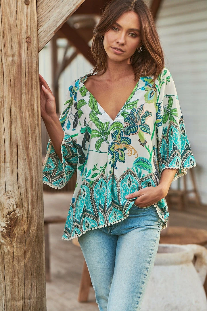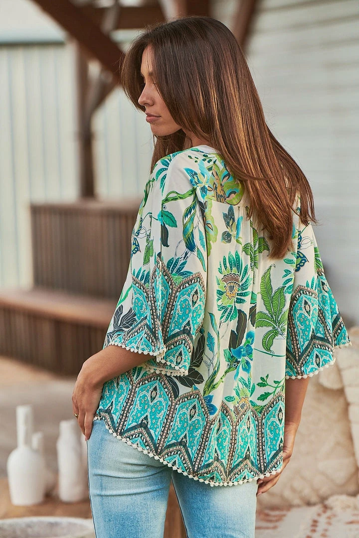 How can you not fall in love with ‘Gabriella’ in ‘Utopia’? The Top we all want in our wardrobe. This statement piece features a soft buttery rayon material in a oversized bright floral boho blouse, crochet scallop trim and a three quarter lantern sleeve.