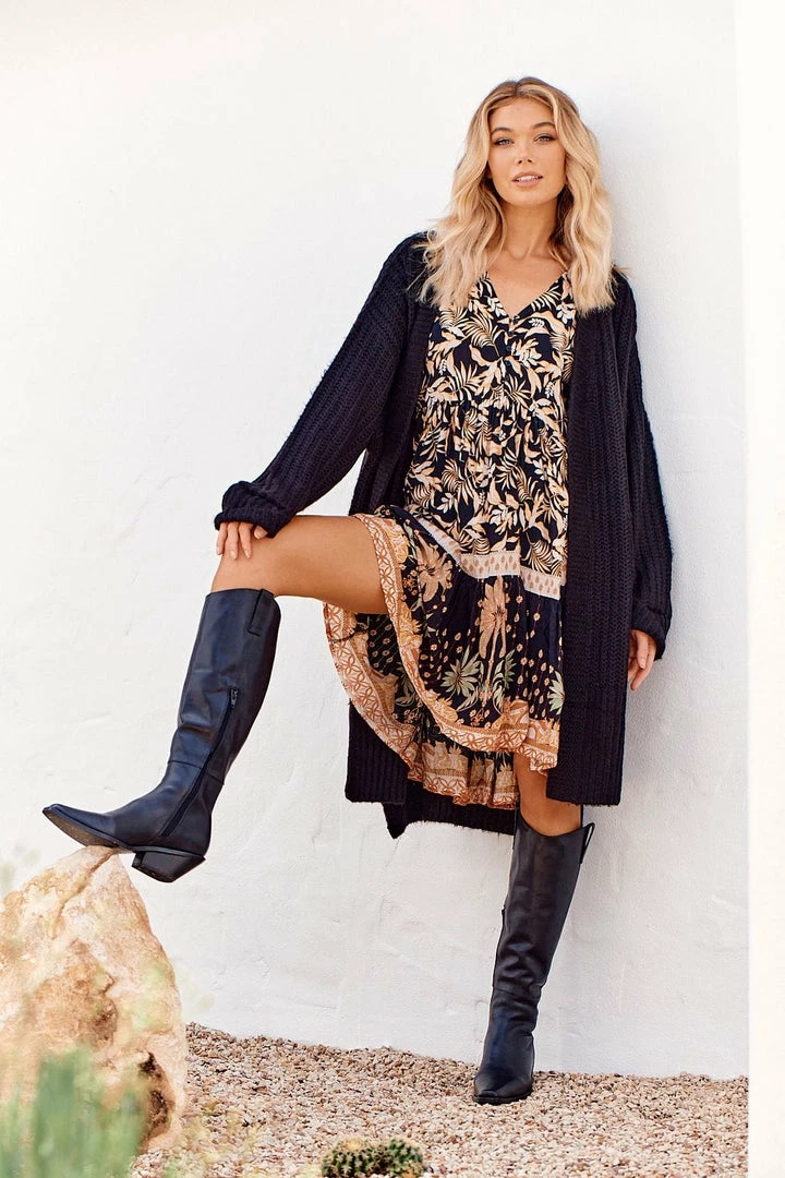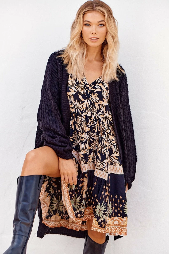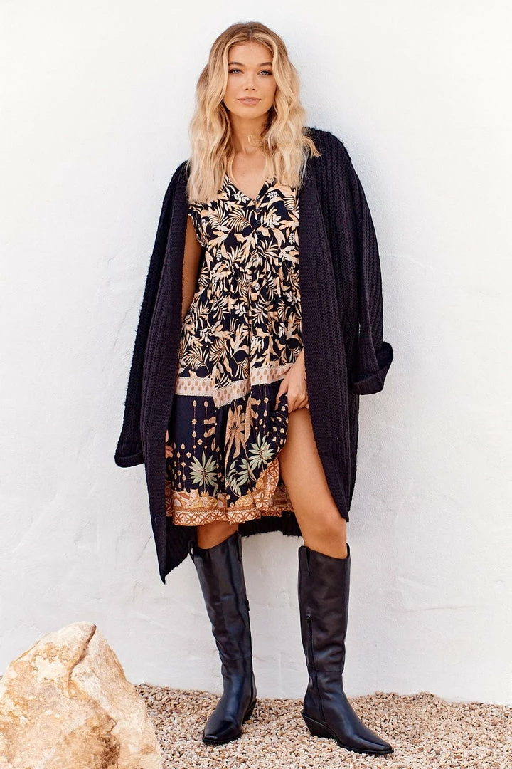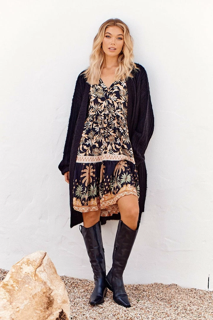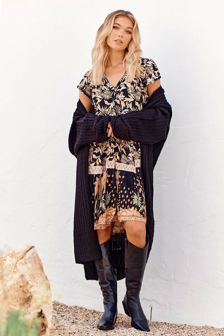 This Boho Tracey mini Dress is one to grab for your next day-time event! The ‘Tracey Dress’ in ‘Jardin’ features a Dark tone with a floral print, mini length, short fluttery sleeves, button up top, relaxed fit and a v neckline.Â