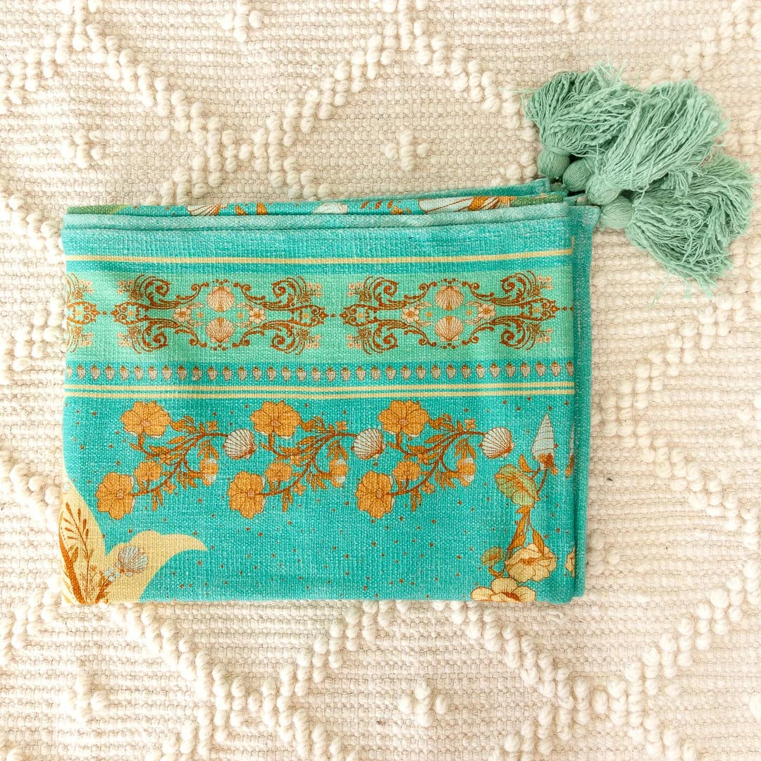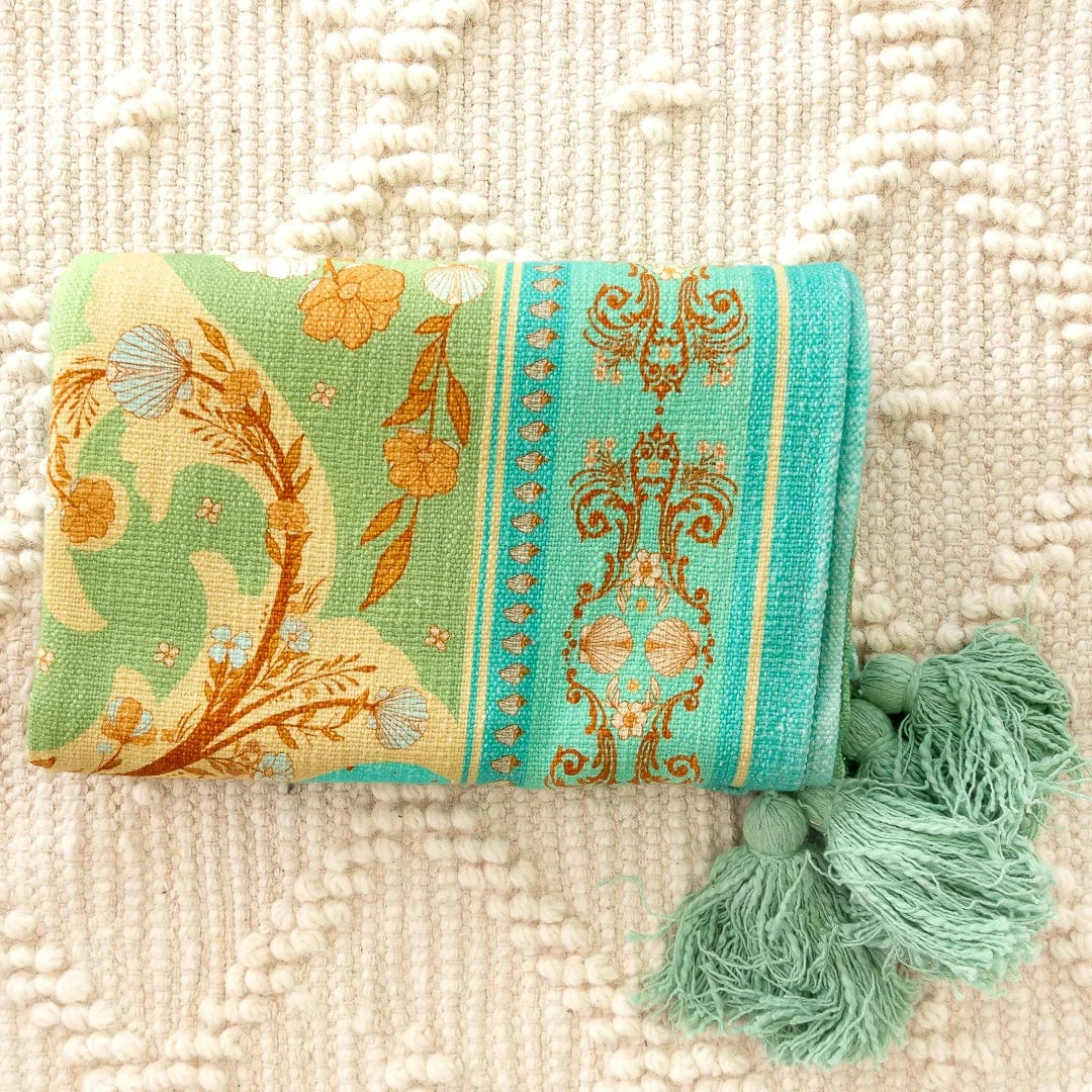 Our Seashell collection features an array of hand drawn seashells mixed with beautiful flowers that dance across a dreamy soft 100% cotton slub fabric, the process of slub fabric gives this fabric an organic carefree feel & look. We have added corner tassels to match each throw, truly topping off that enchanted feel of the designs.Â