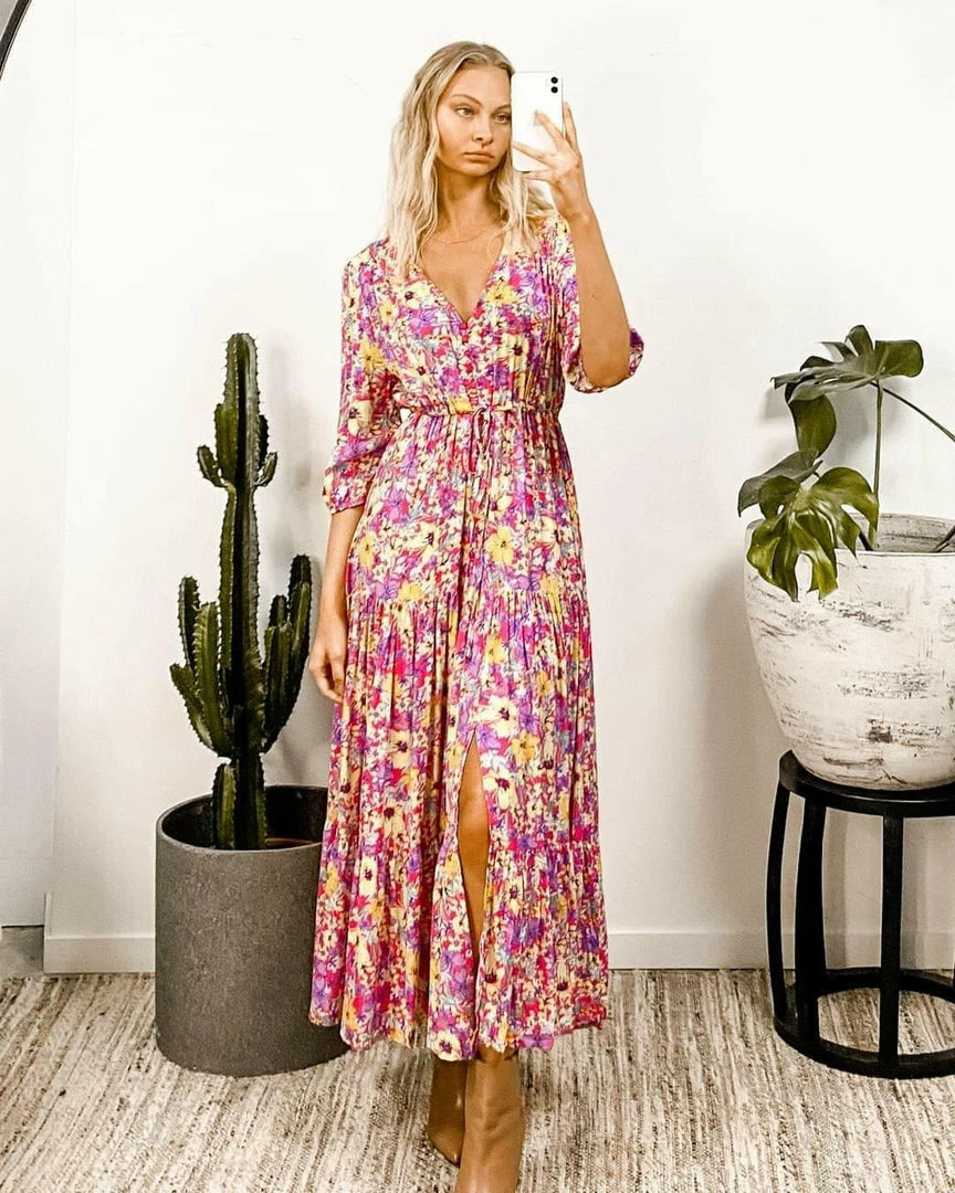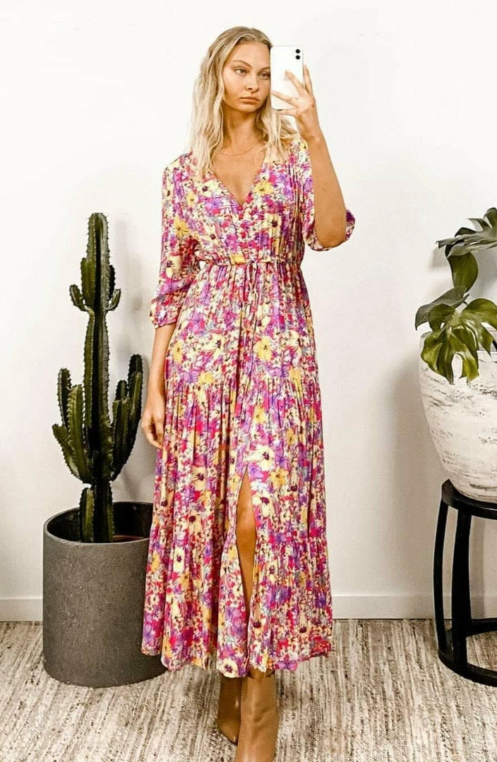 If you are obsessed with vibrant prints you are going to adore our latest Marilyn Maxi Dress by Label of Love in Pink Floral. Not only does this style scream comfort, it also screams style with the beautiful 3/4 sleeves and the drawn in waist.Â