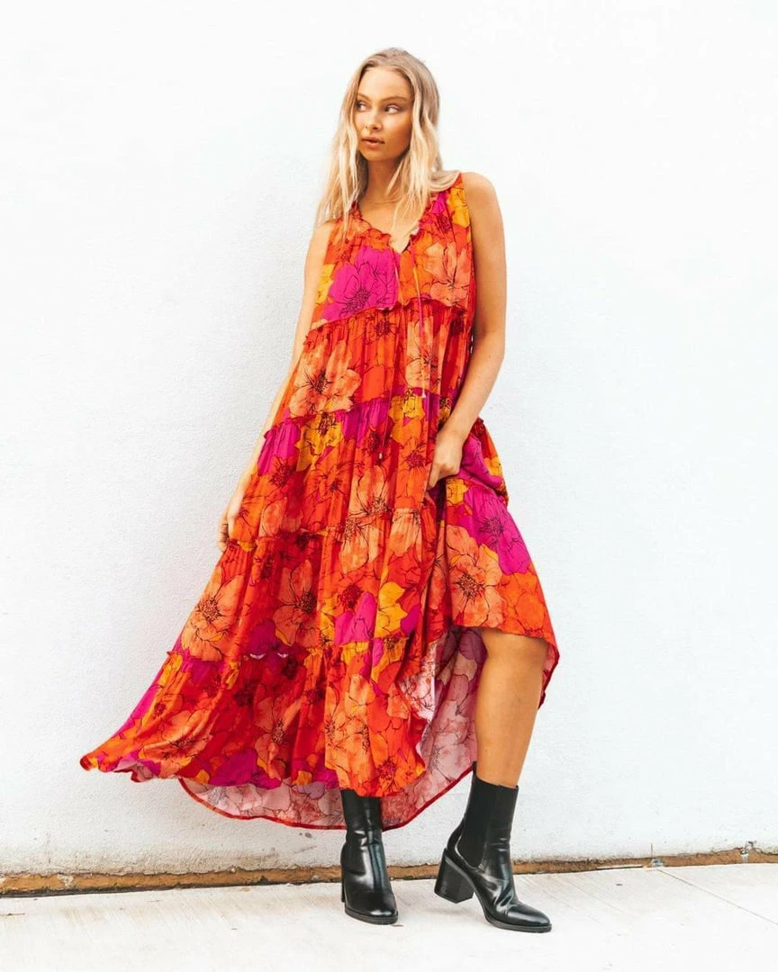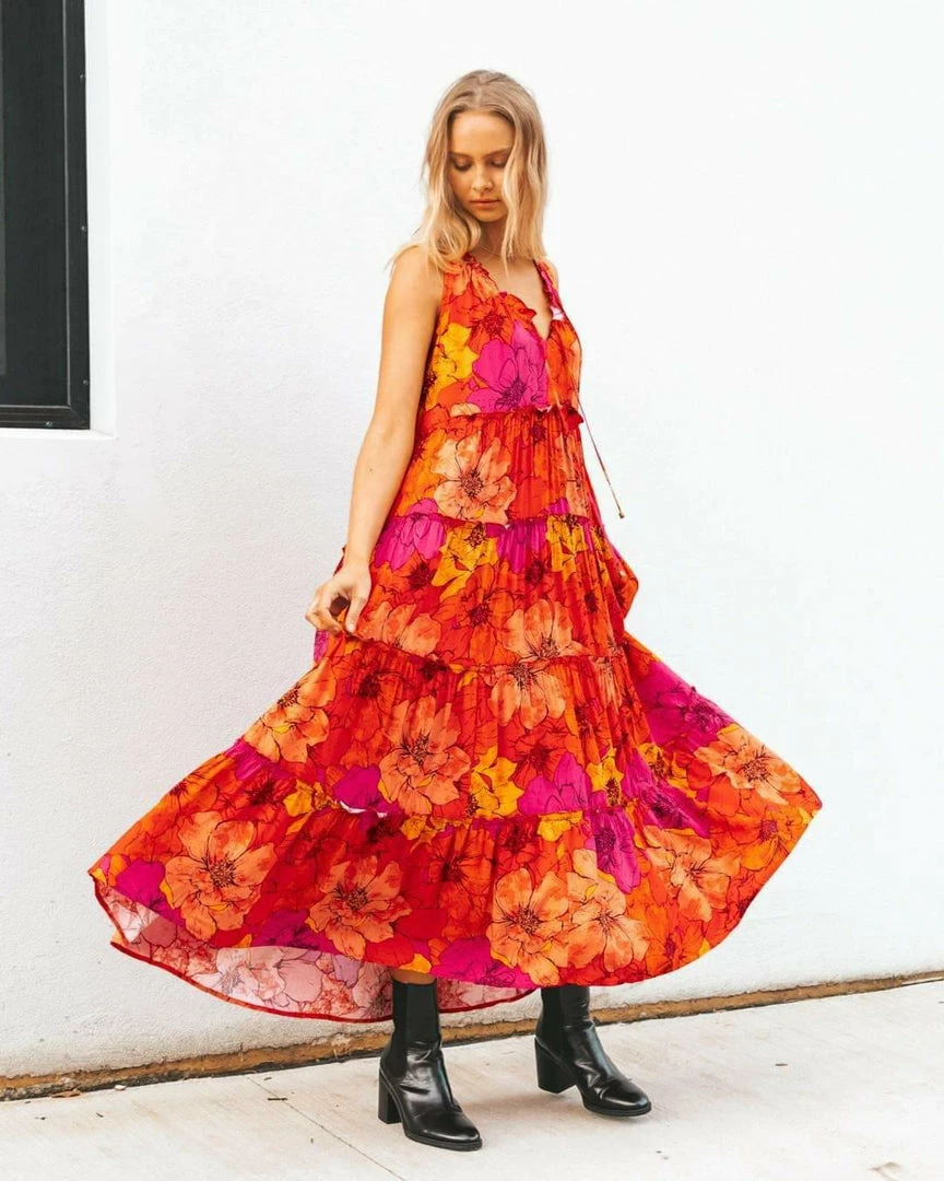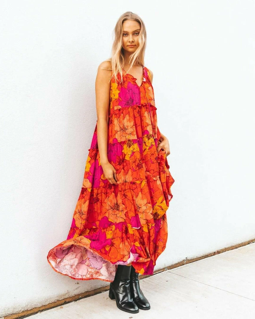 We just cant get enough of bright floral prints! The darling ‘Soleil Sun Maxi Dress’ features a orange tone with bright floral print, a maxi length, gathered detailing around the bust and thick ruffled straps.