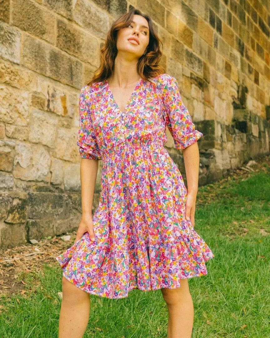 Feeling bright and good- the ‘Ziggy Dress’ is the perfect mini. It features a rainbow mixed  tone, V-neckline, shirred elasticated waistline, 3/4 sleeves with elasticated cuff and a relaxed flowy fit.