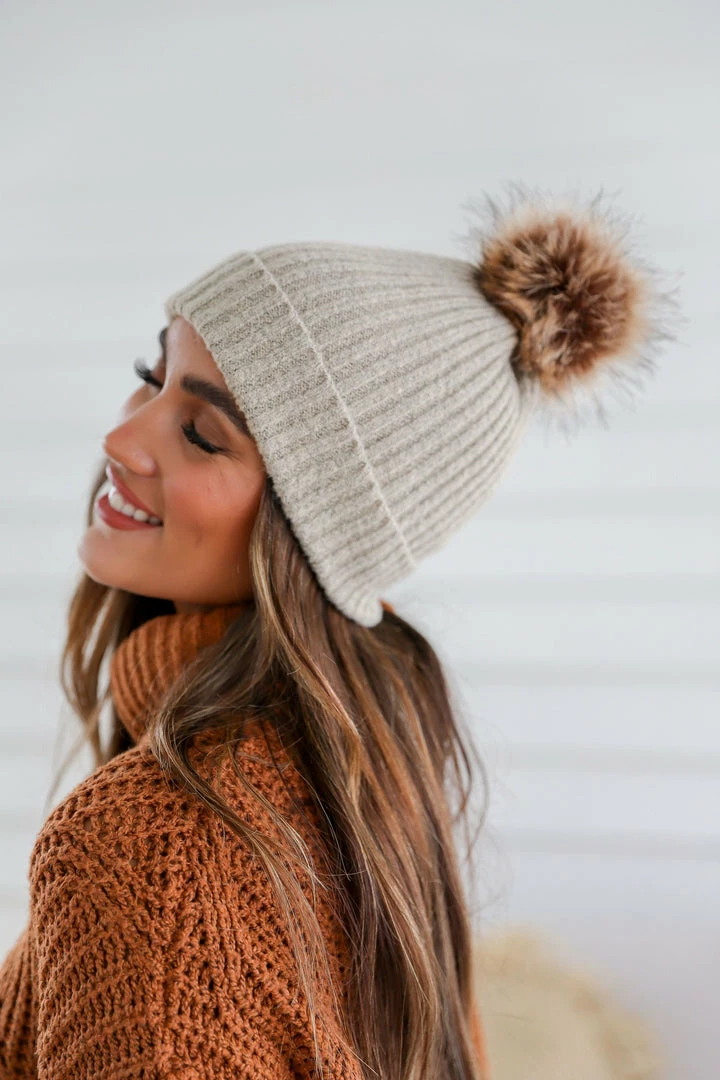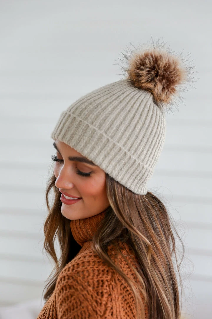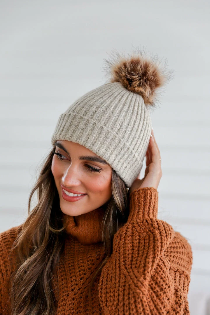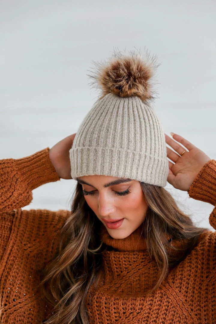 Finish off your boho look with this so effortlessly eye-catching beanie featured in a soft acrylic and structured-style with stunning ribbed stitching and a faux fur pom pom.Â
