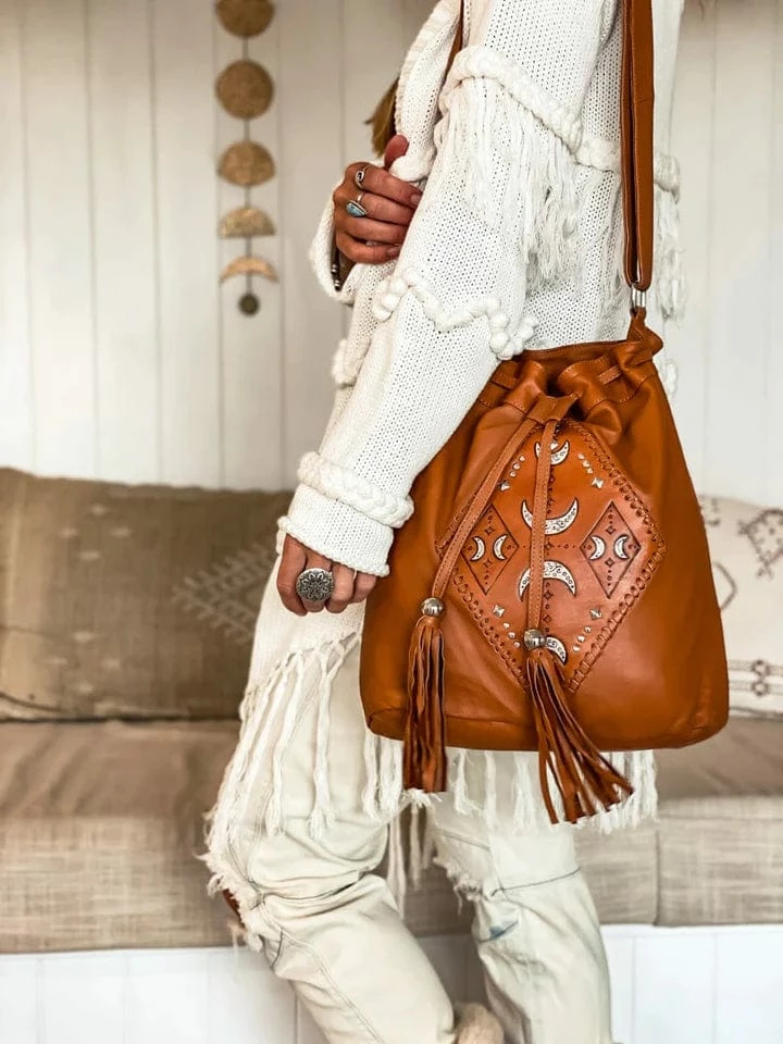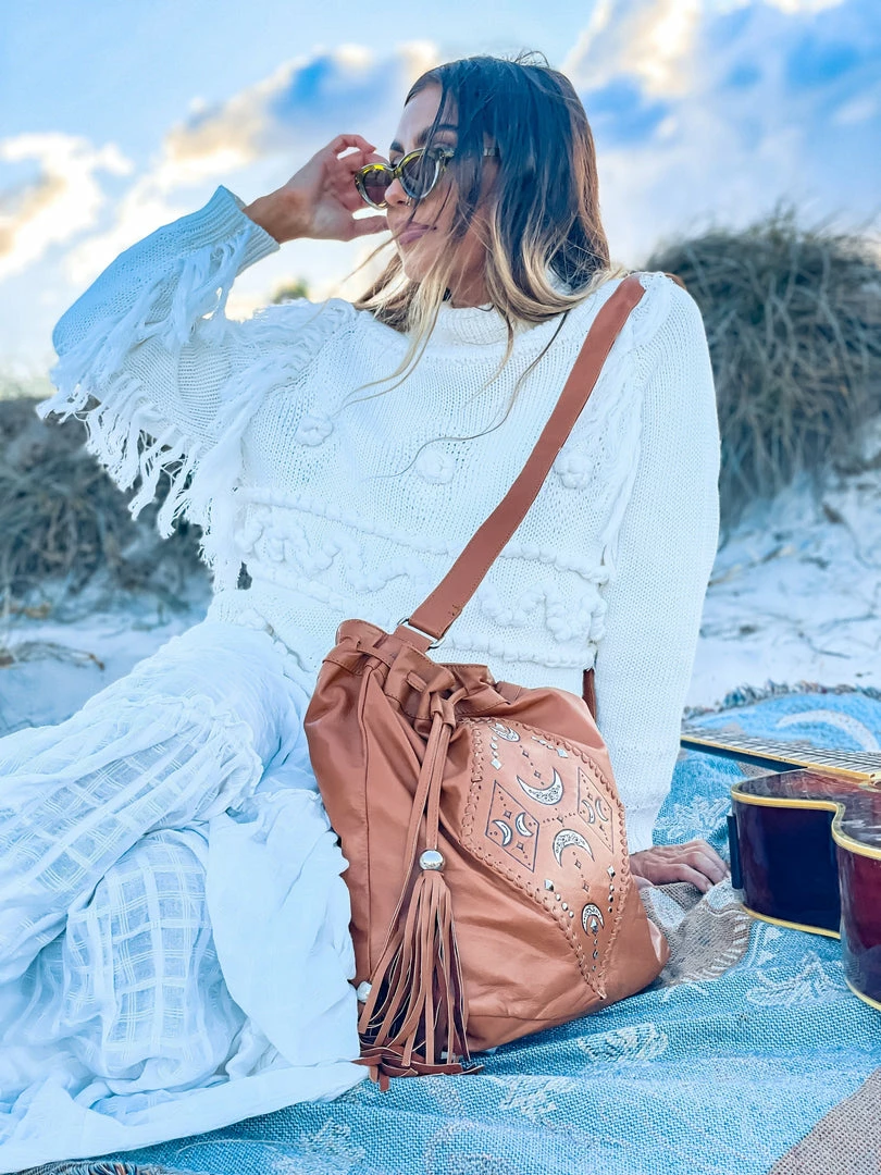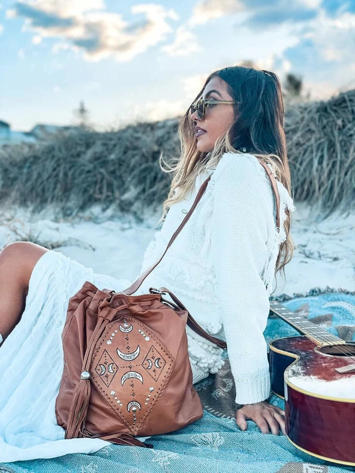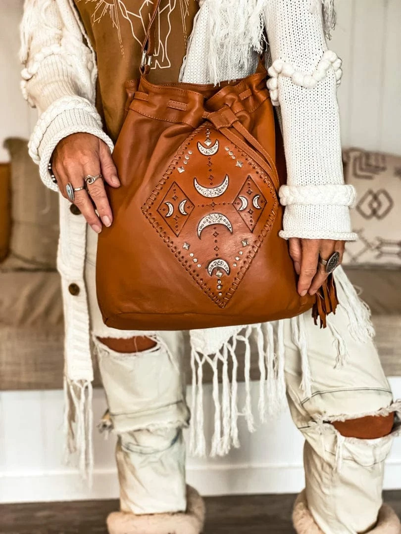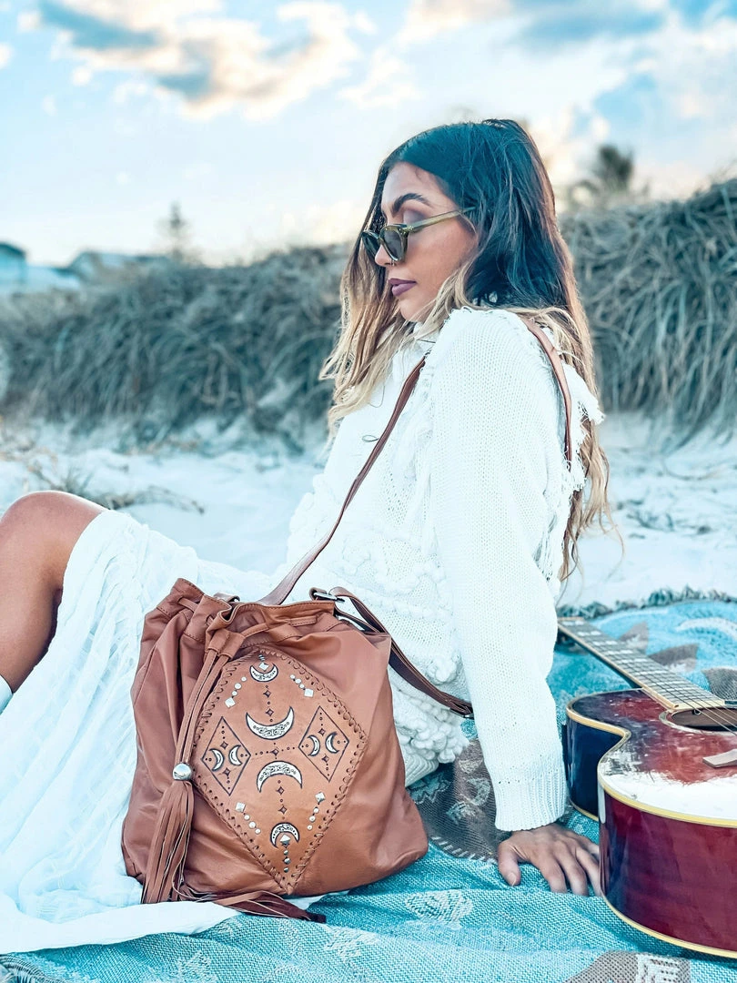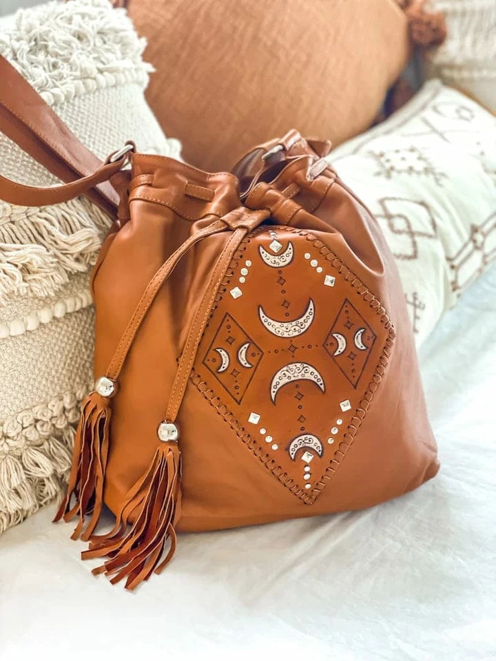This special piece features her divine hand painted moons symbolic to the way she is drawn to the night sky. Studded detailing, Adjustable Strap, Pull tie fastening and all the internal pockets and space in order to keep you organised from day to day.