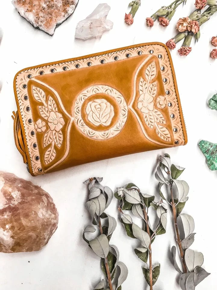 The perfect combination of boho luxe and understated cool, the Golden Gypsy Wallet will be your perfect roadie companion. Featuring our rose hand tooled design and silver hardware.