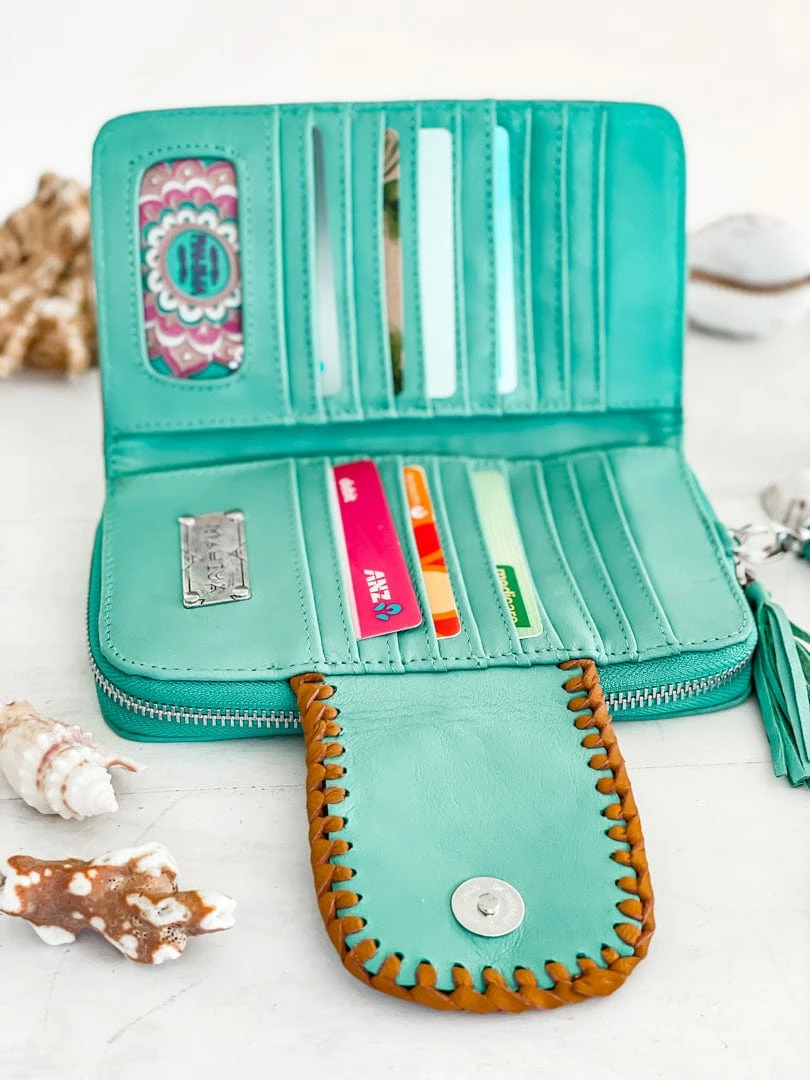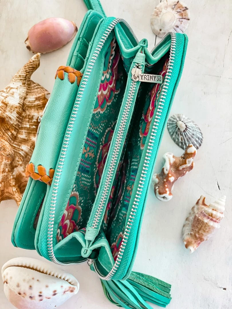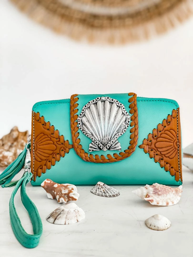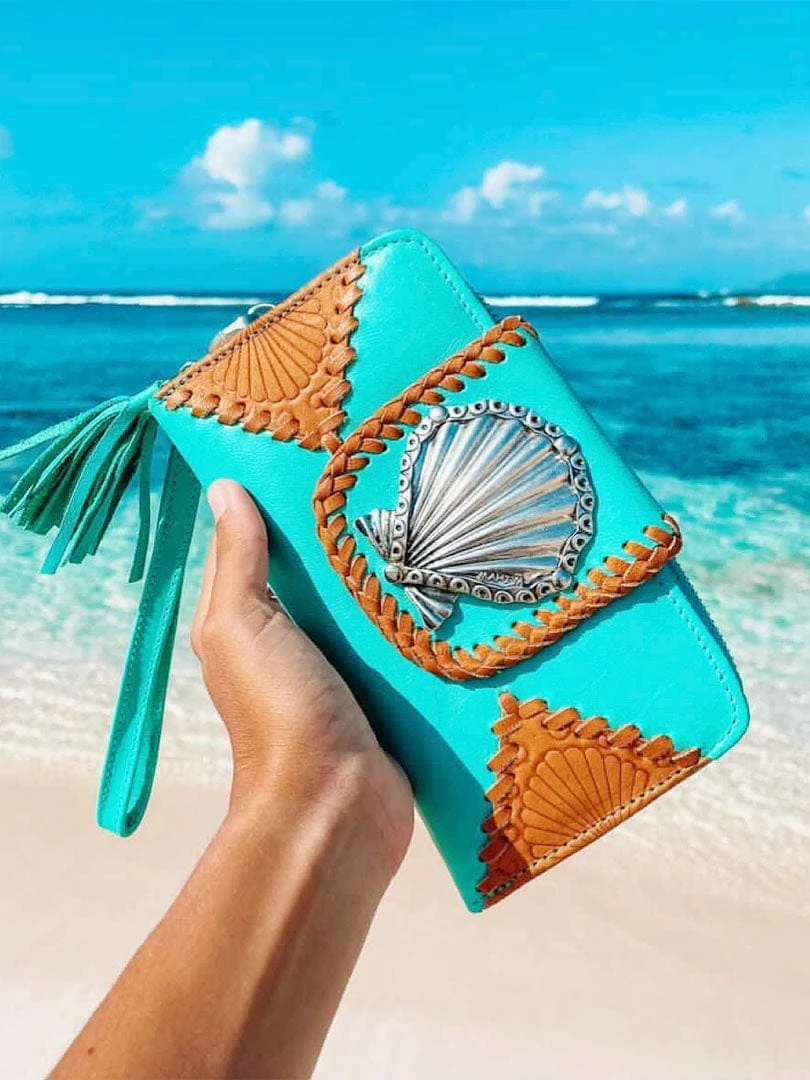 She sells sea shells by the sea shore. Our new Shells Purse is made for Ocean lovers. This stunning turquoise leather boho purse features our new Clam Shell inlay and hand tooled details.