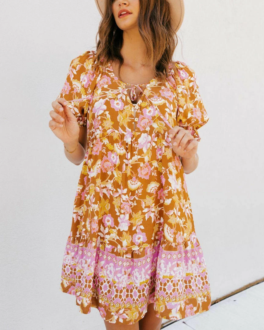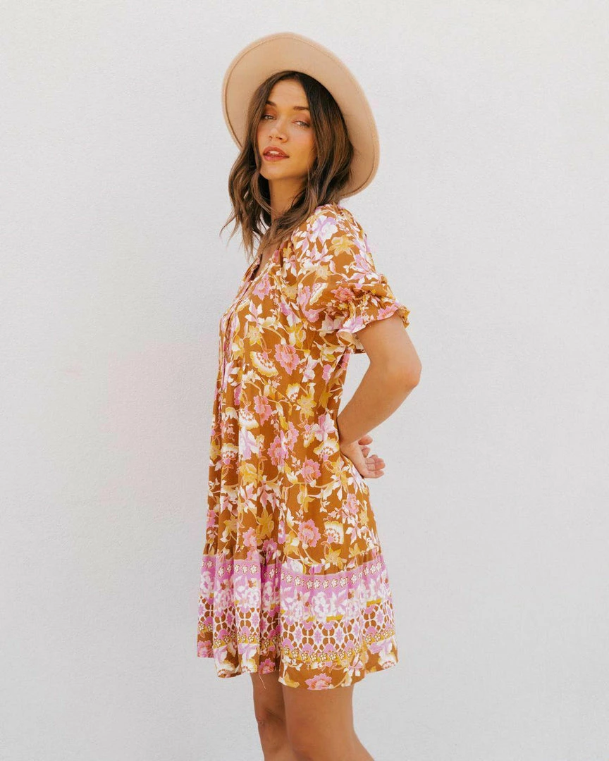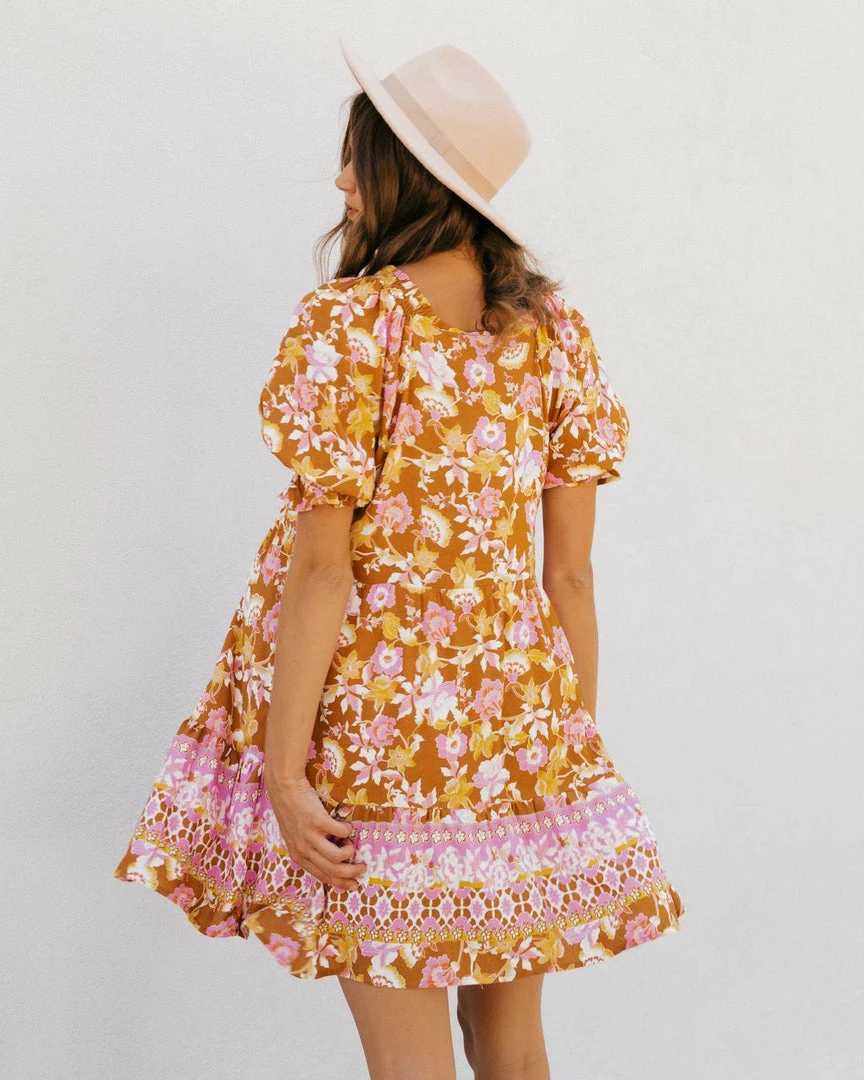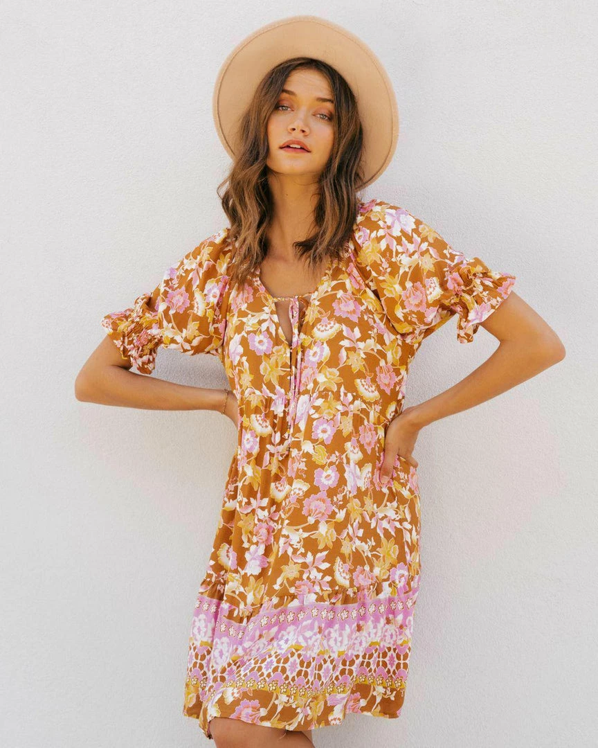 How sweet and girly is this Autumn coloured dress?! The ‘Mairead Mini Dress’ features a soft Rayon material, Retro style floral print, low neckline, mini length and flowy skirt.