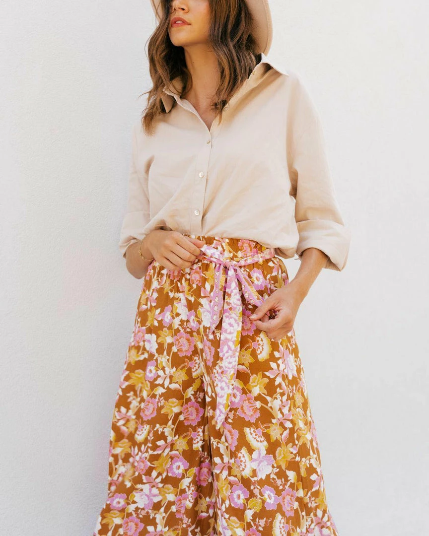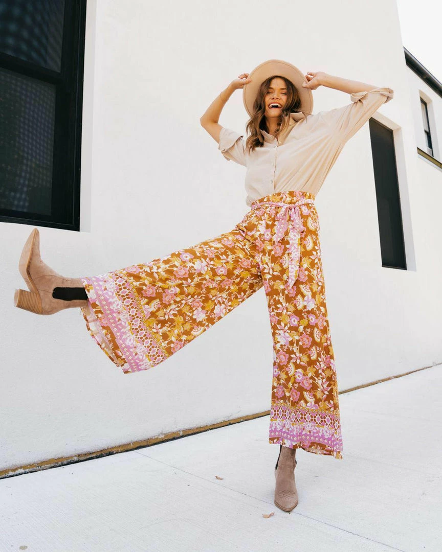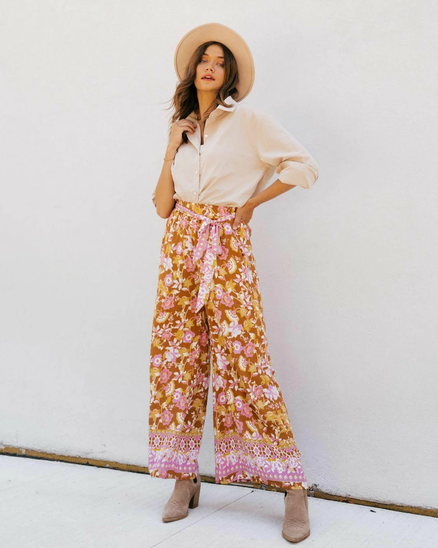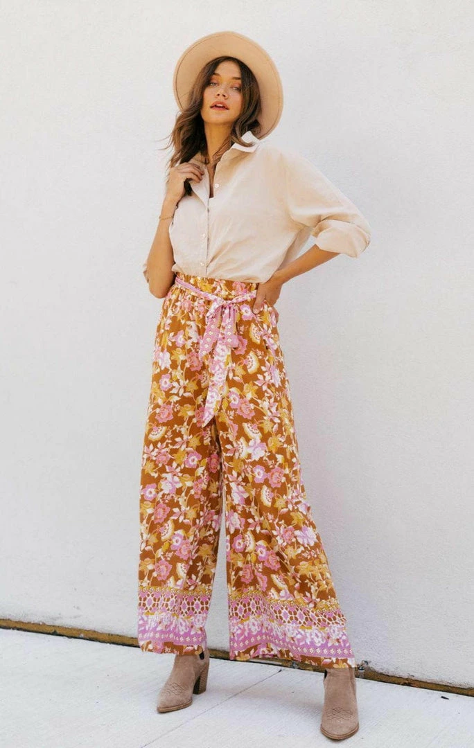The ‘Mairead Pants’ are a versatile pair of bottoms that can easily be dressed up or dressed down with its gorgeous retro floral and earthy tone and relaxed fit. These pants also features a high waisted fit and elastic waistband with tie. These pants are paired best with a boho tee.Â