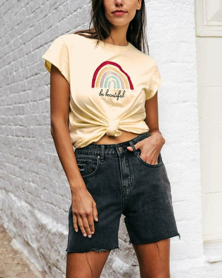 A simple yet stylish Butter toned tee with ‘Bee Beautiful’ slogan and a rainbow embroidered, the perfect tee to complete your boho looks!