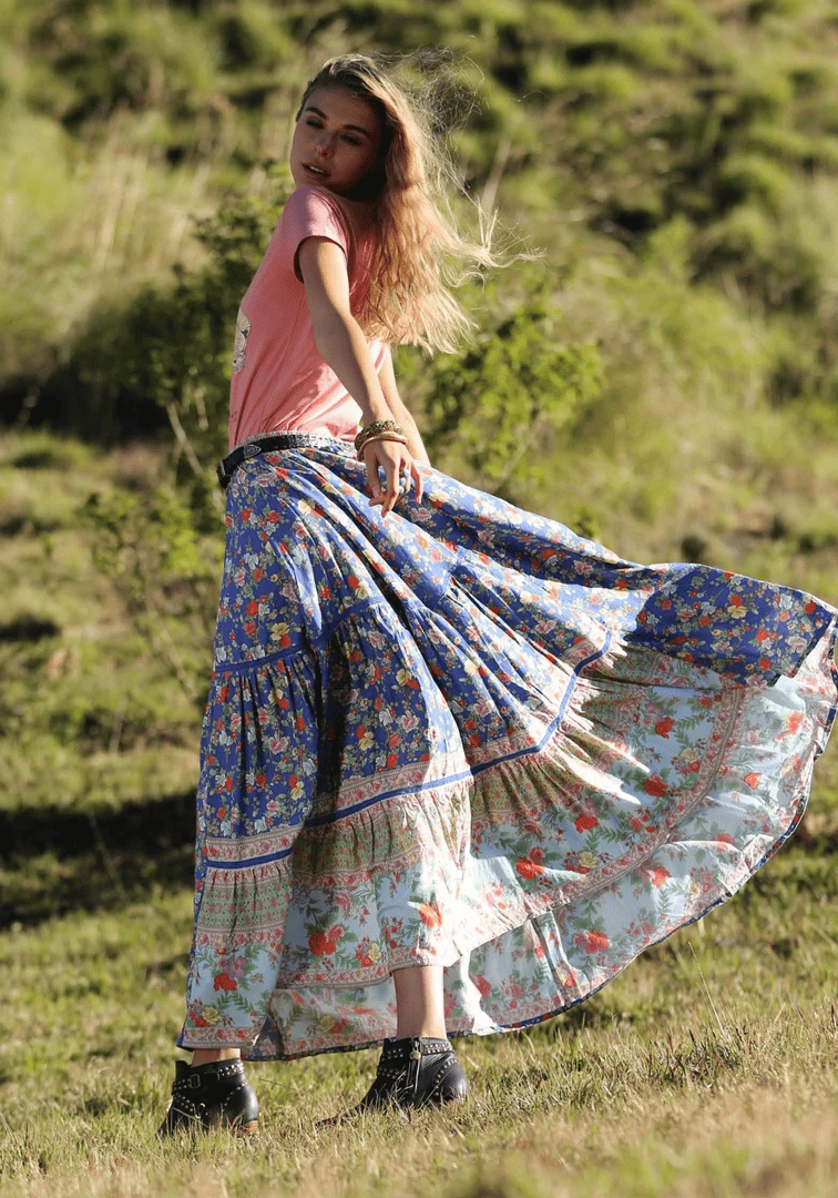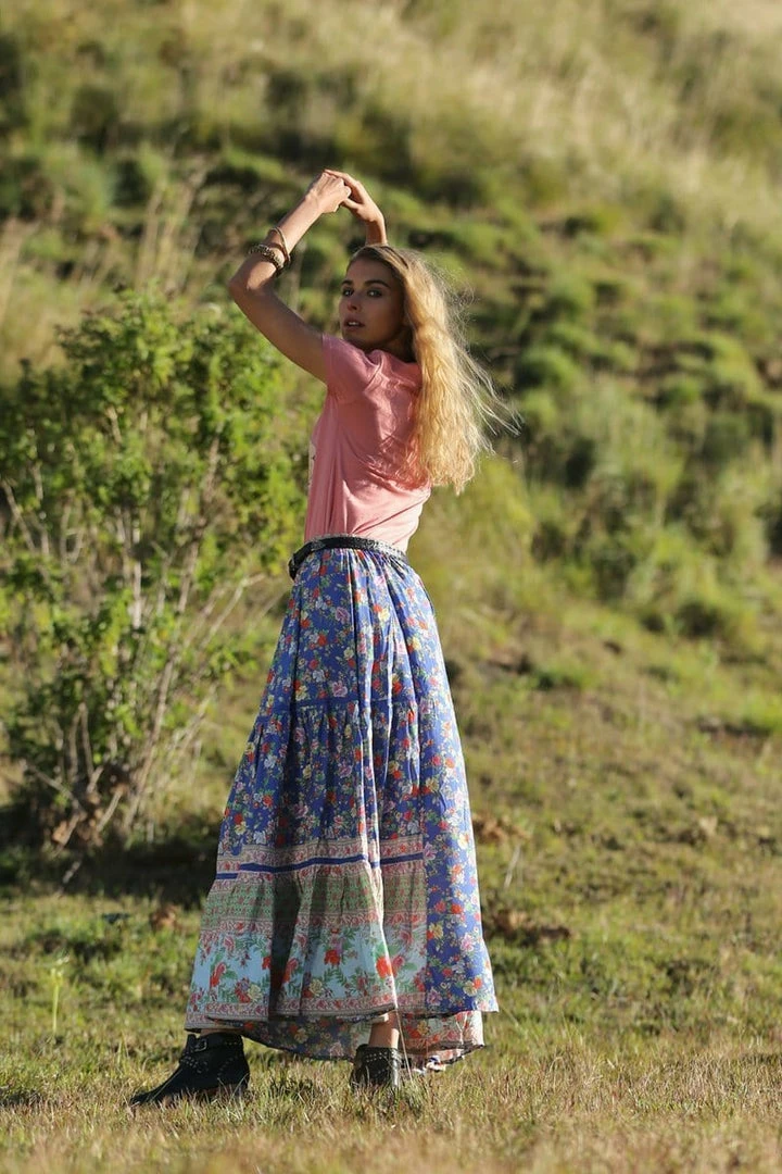 Our beautiful Ravennah Maxi Skirt is set to become your new boho wardrobe favourite! Made from the softest rayon and featuring our pretty new print, this skirt is perfect to pair with our off-shoulder blouses for the ultimate gypsy look. Mix and match with different prints and colours to create beautiful and versatile outfits. Wear it back with your favourite tee and white sneakers for perfect everyday style. The skirt features our essential elastic waist for fit and comfort and three cascading tiers of lavish fabric ready to catch the breeze for that perfect swish! Featuring our stunning Lost in Paradise print with vibrant flowers, this gorgeous skirt is available in three colours, Rococo Red, Lapis Lazuli and Lotus.