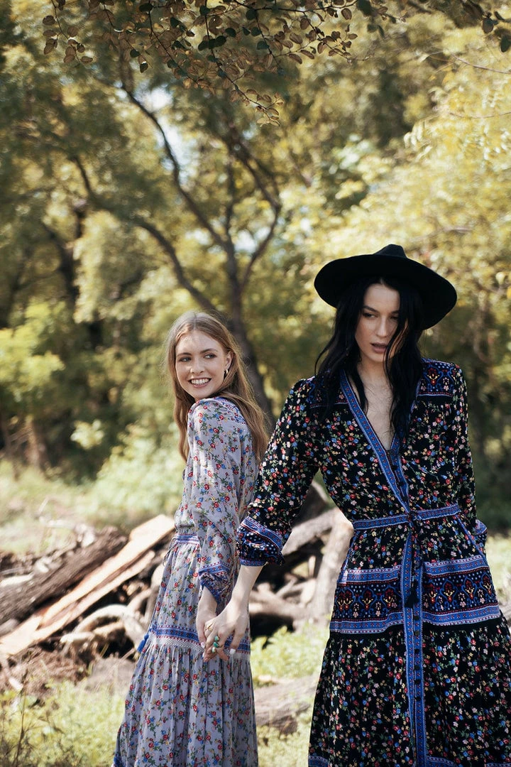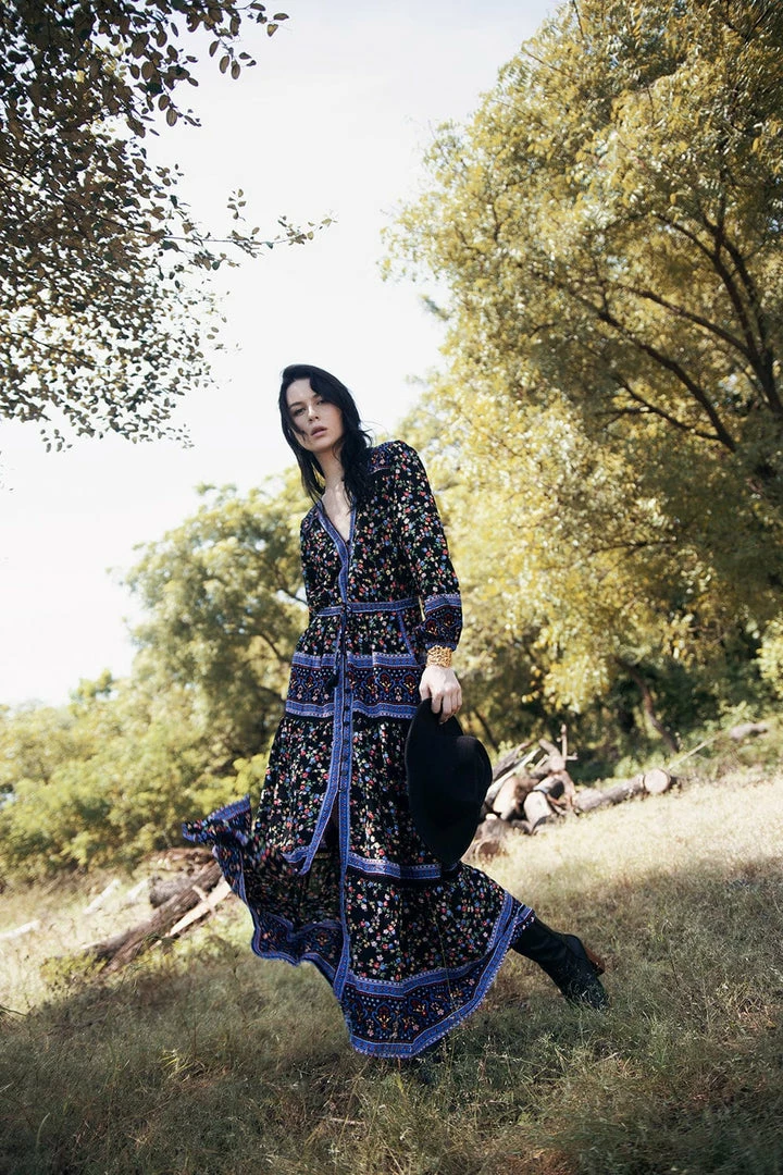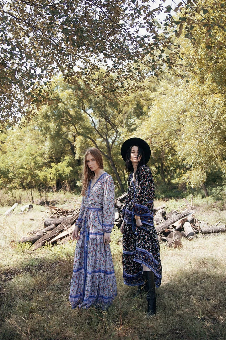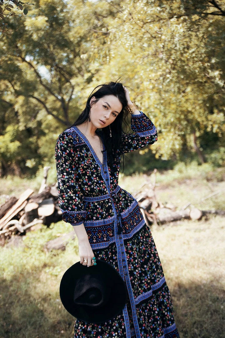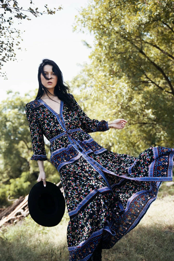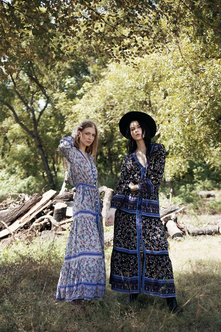 Introducing the Captivating New Alannah Maxi, a glorious gypsy queen style that perfectly showcases our whimsical ditsy charm print scattered with tiny wildflowers. The ultimate feminine style for romantic lunches with your love or drinks with friends, this dress will take you anywhere. This boho maxi dress is beautifully generous and sweeps into a stunning tiered cascade , providing the ultimate swish. This floral maxi dress is sure to impress at your next meeting with its effortless elegant silhouette and lady like details. Drift away on a cloud of beautiful soft fabric, you will want this dress in every colour.Â