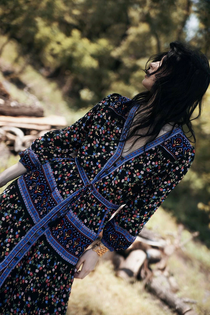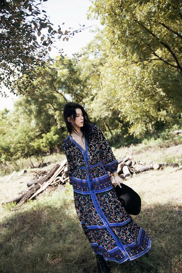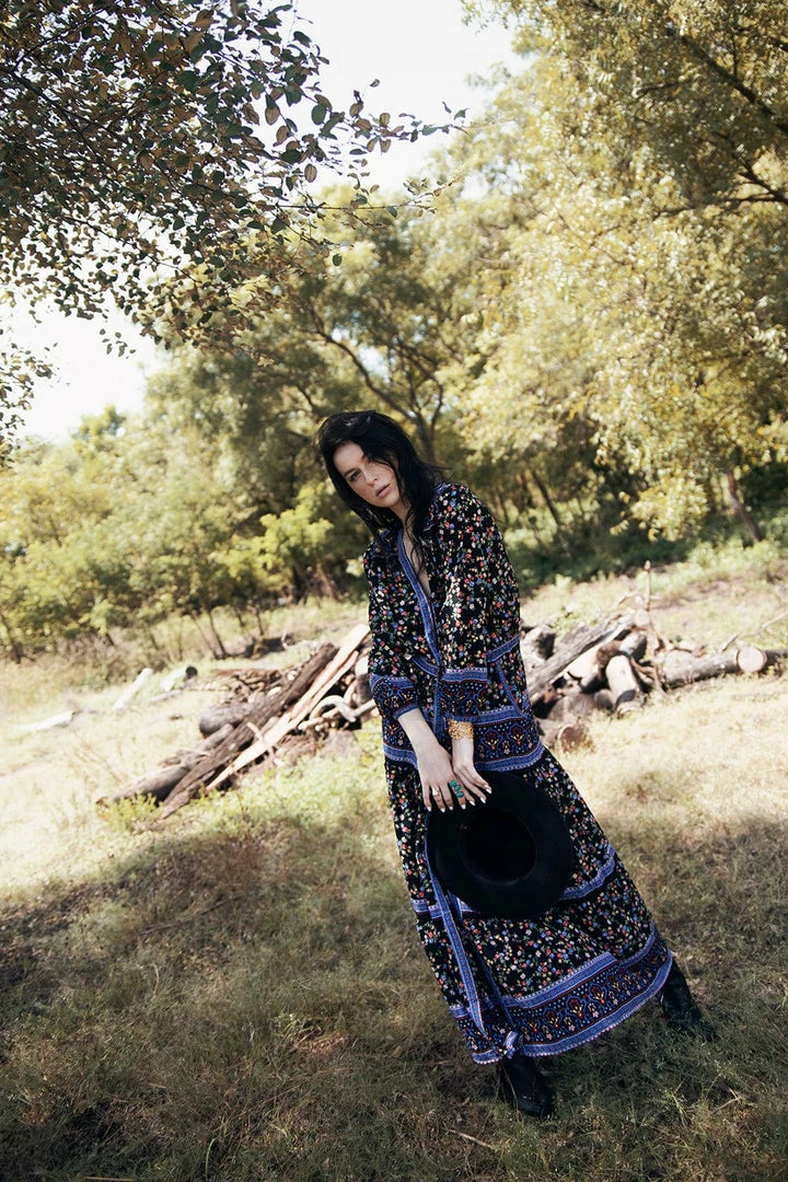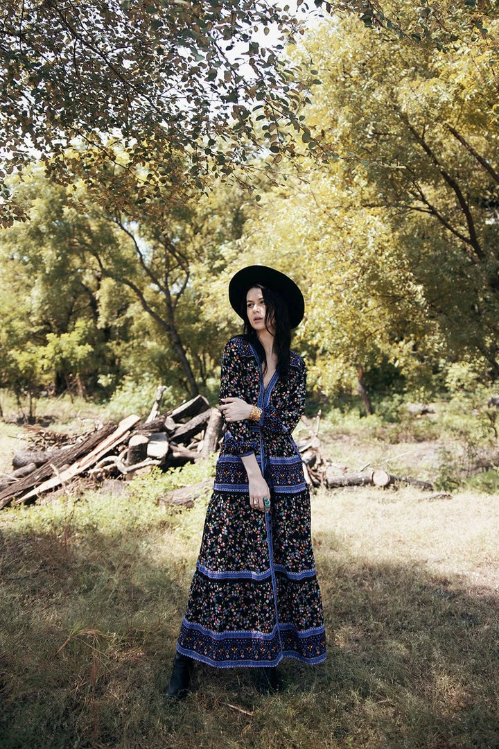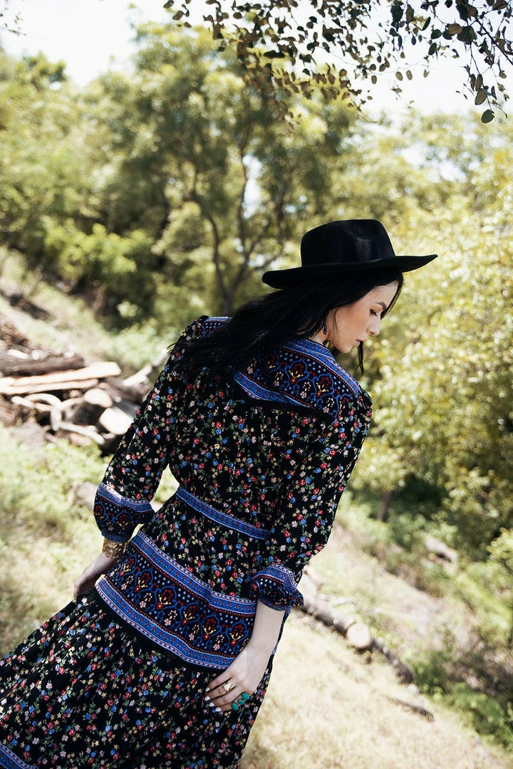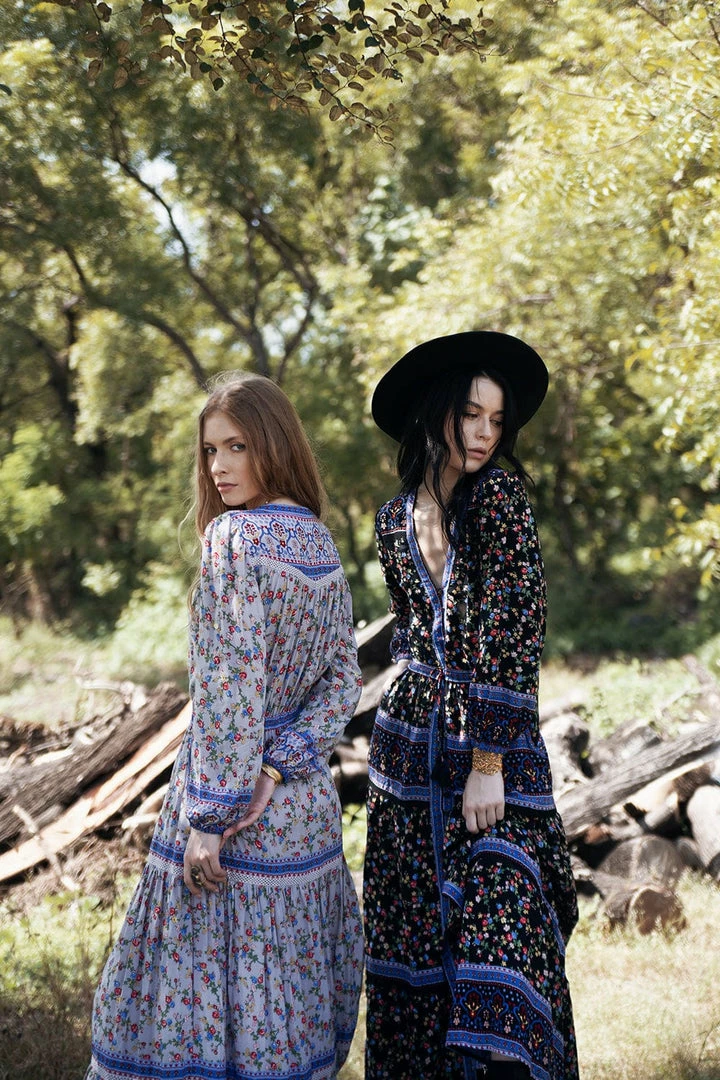 Introducing the Captivating New Alannah Maxi, a glorious gypsy queen style that perfectly showcases our whimsical ditsy charm print scattered with tiny wildflowers. The ultimate feminine style for romantic lunches with your love or drinks with friends, this dress will take you anywhere. This boho maxi dress is beautifully generous and sweeps into a stunning tiered cascade , providing the ultimate swish. This floral maxi dress is sure to impress at your next meeting with its effortless elegant silhouette and lady like details. Drift away on a cloud of beautiful soft fabric, you will want this dress in every colour.Â
